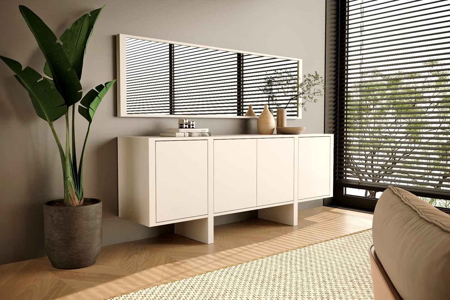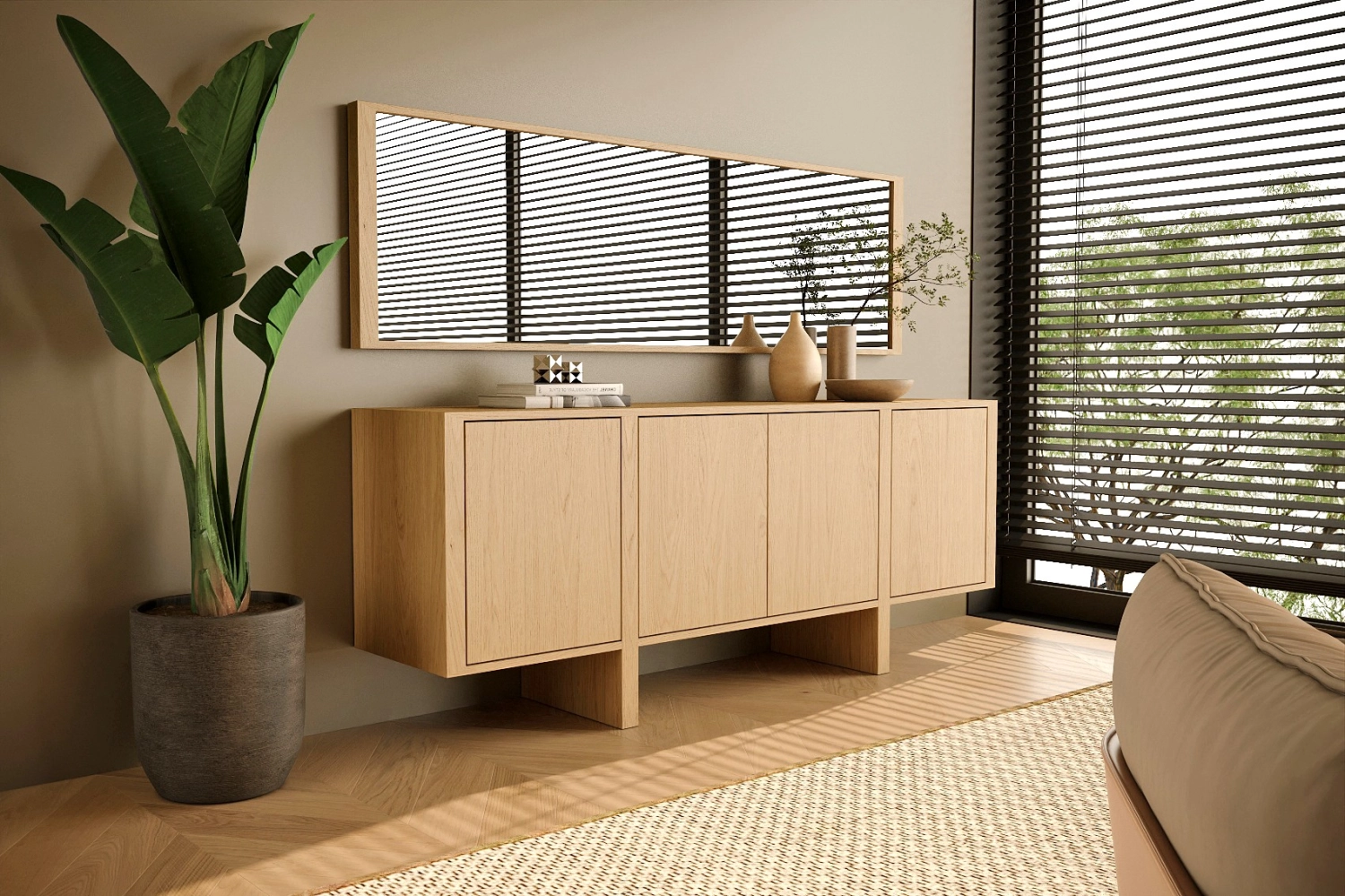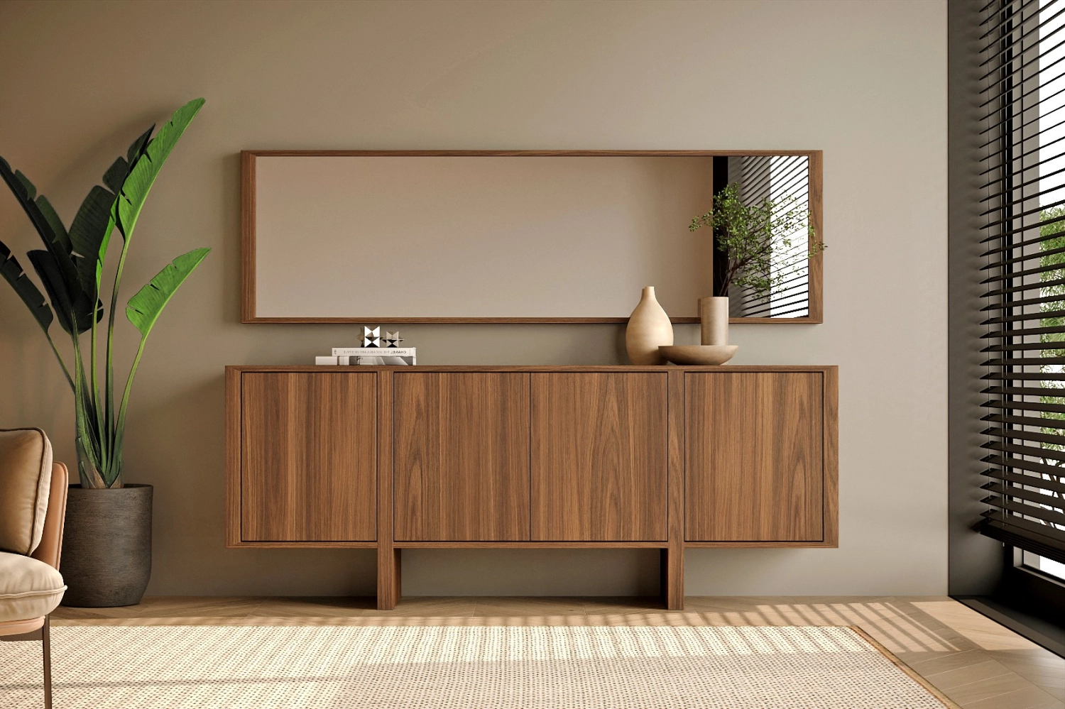 Aparador Dual com pés e espelho fabricado em folha de madeira natural ou MDF Lacado