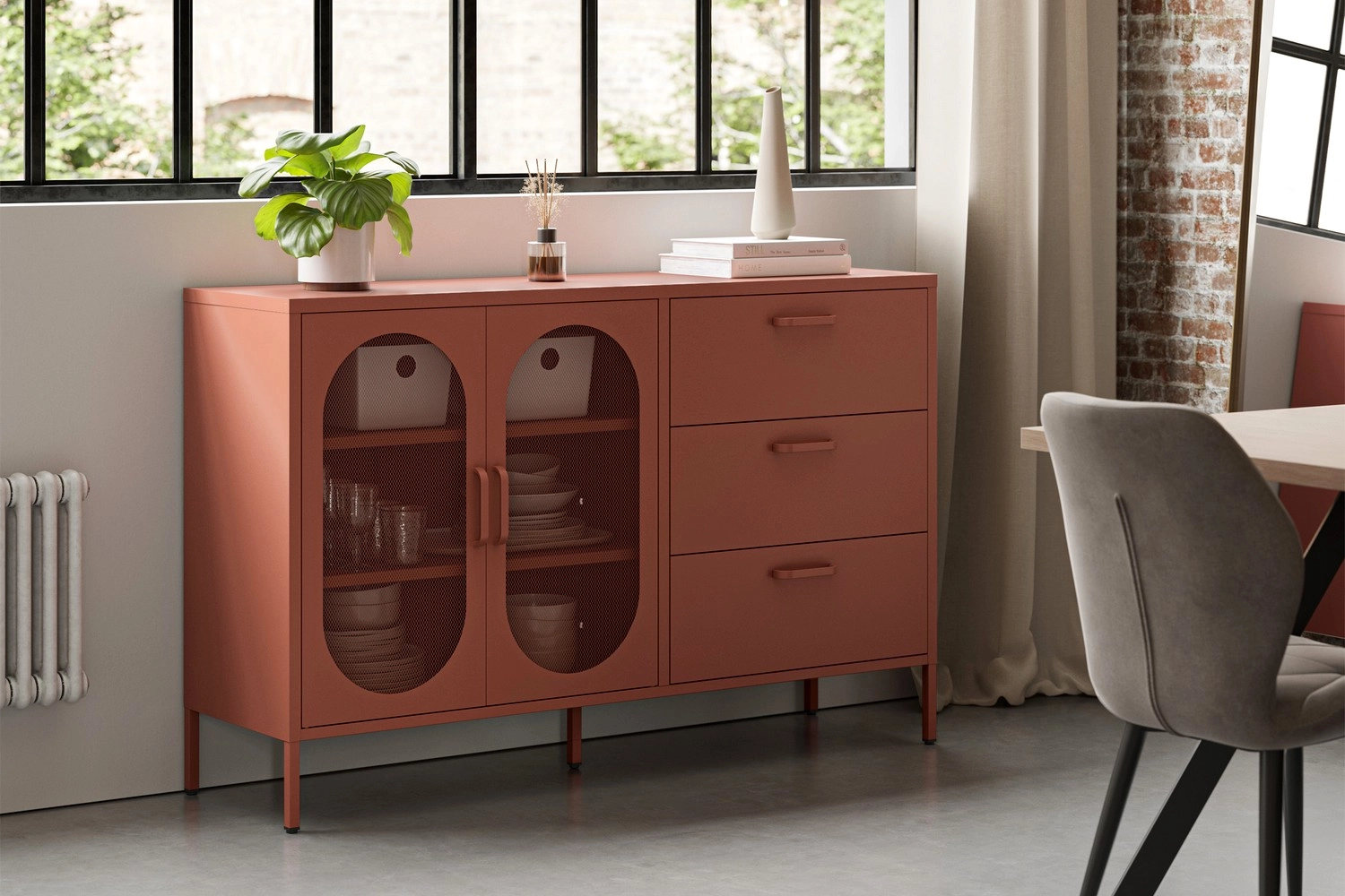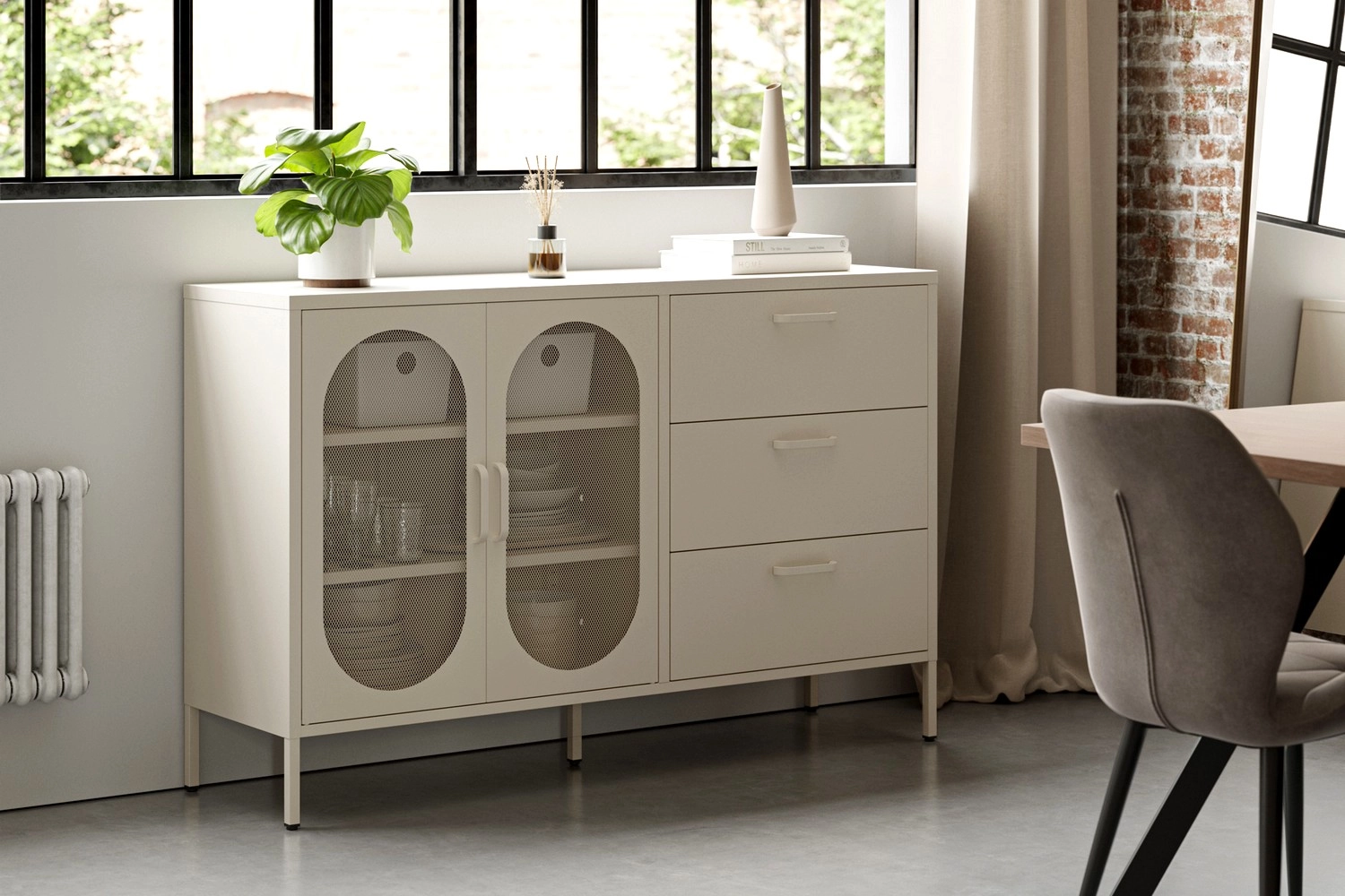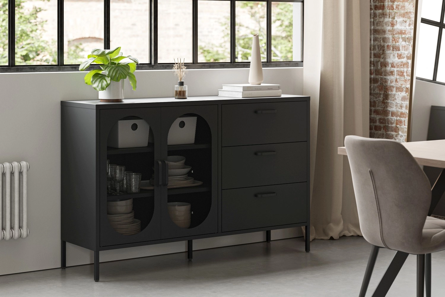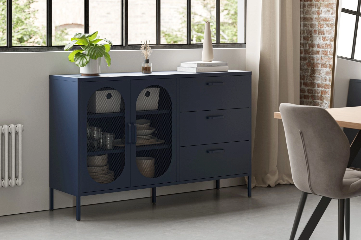 Aparador metálico Diora combina a robustez do metal com um design contemporâneo que valoriza a sala de jantar ou a cozinha. Três gavetas discretas e um armário com portas de vidro proporcionam organização prática para loiça, copos e utensílios do dia a dia. A altura sobre pernas facilita a limpeza do chão e cria sensação de leveza no espaço. O acabamento escuro e as linhas simples tornam este aparador metálico adaptável a vários estilos decorativos, enquanto a superfície superior funciona como apoio para peças decorativas ou serviço. Ideal para quem procura armazenamento funcional sem perder elegância.