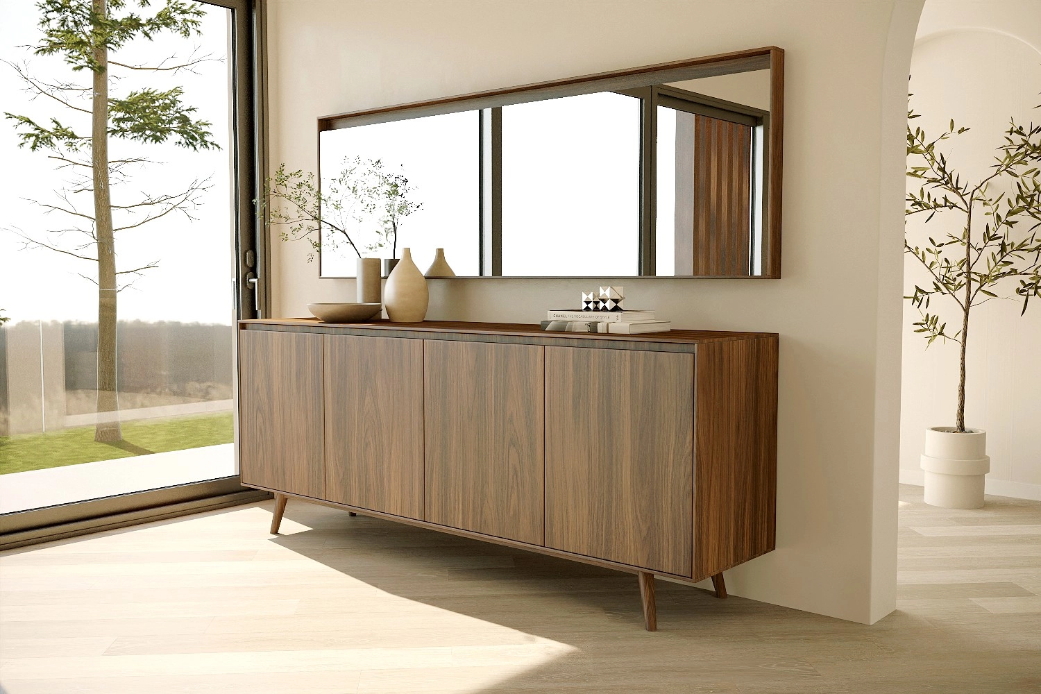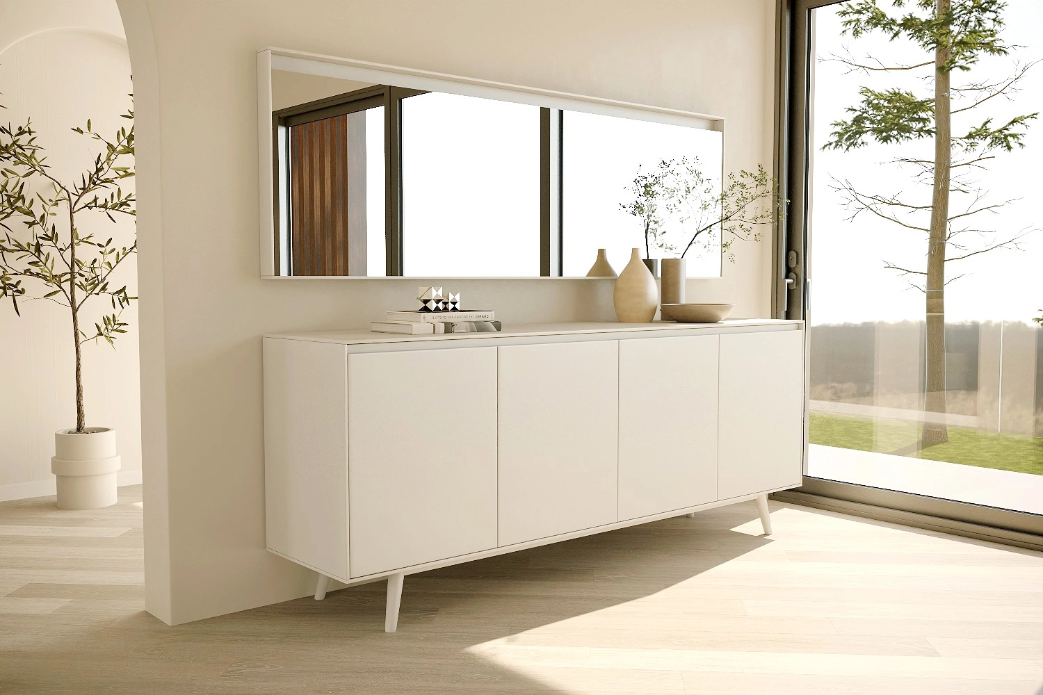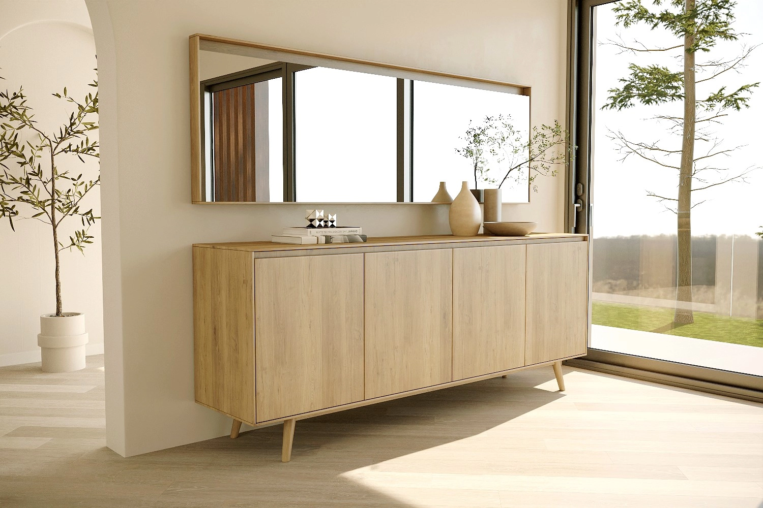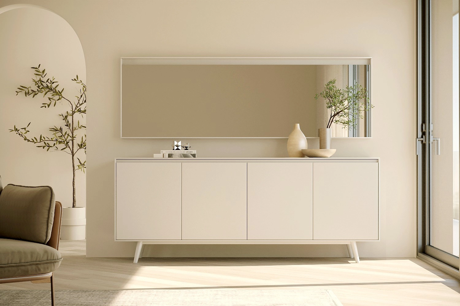Aparador Nórdico com pés e espelho fabricado em folha de madeira natural ou MDF Lacado.