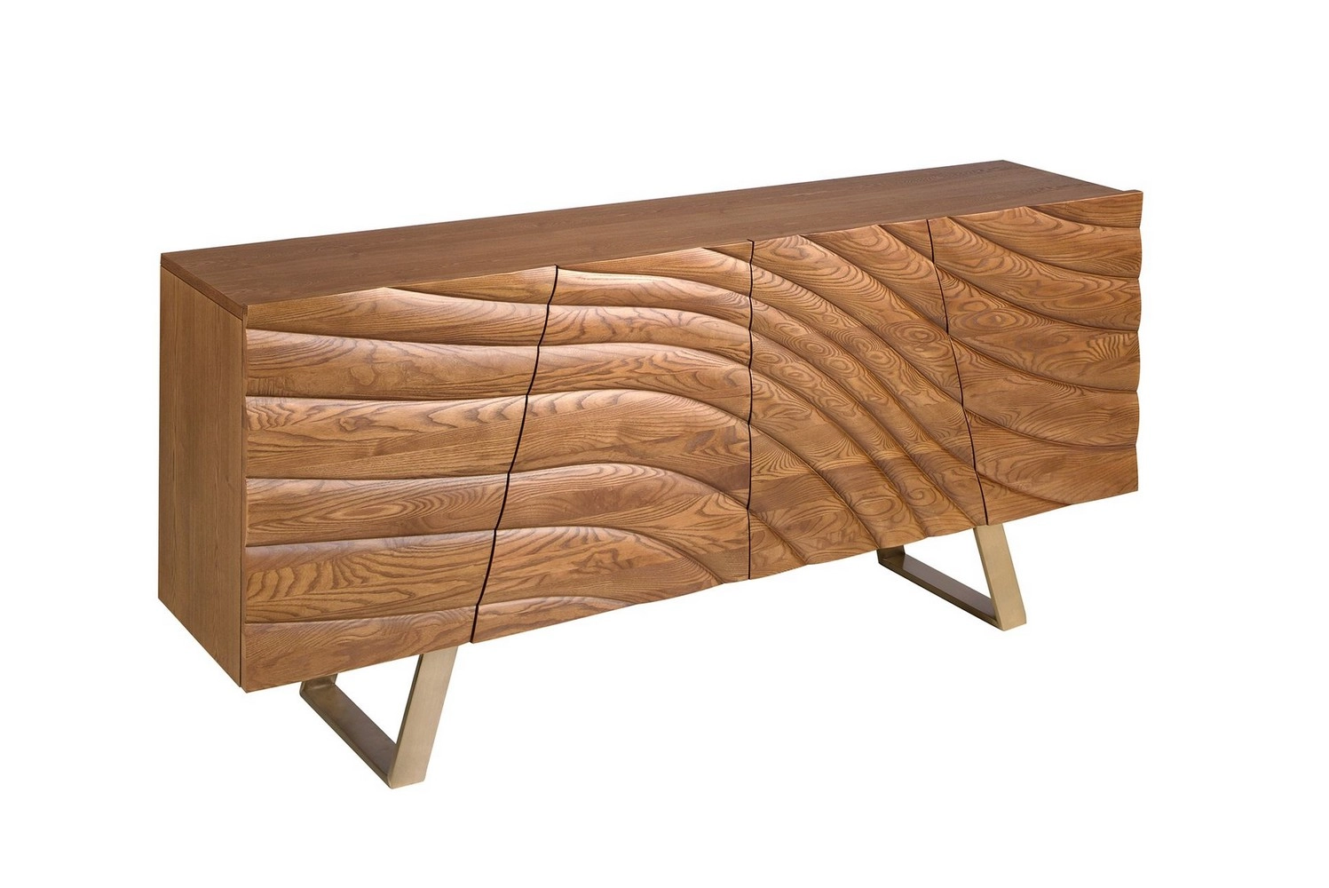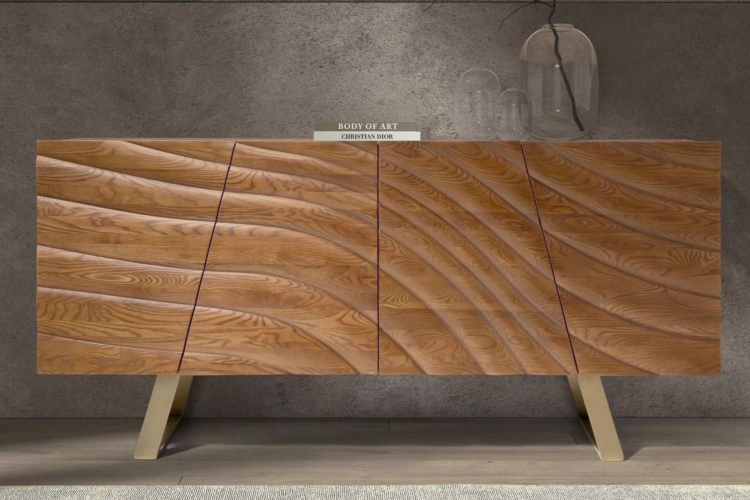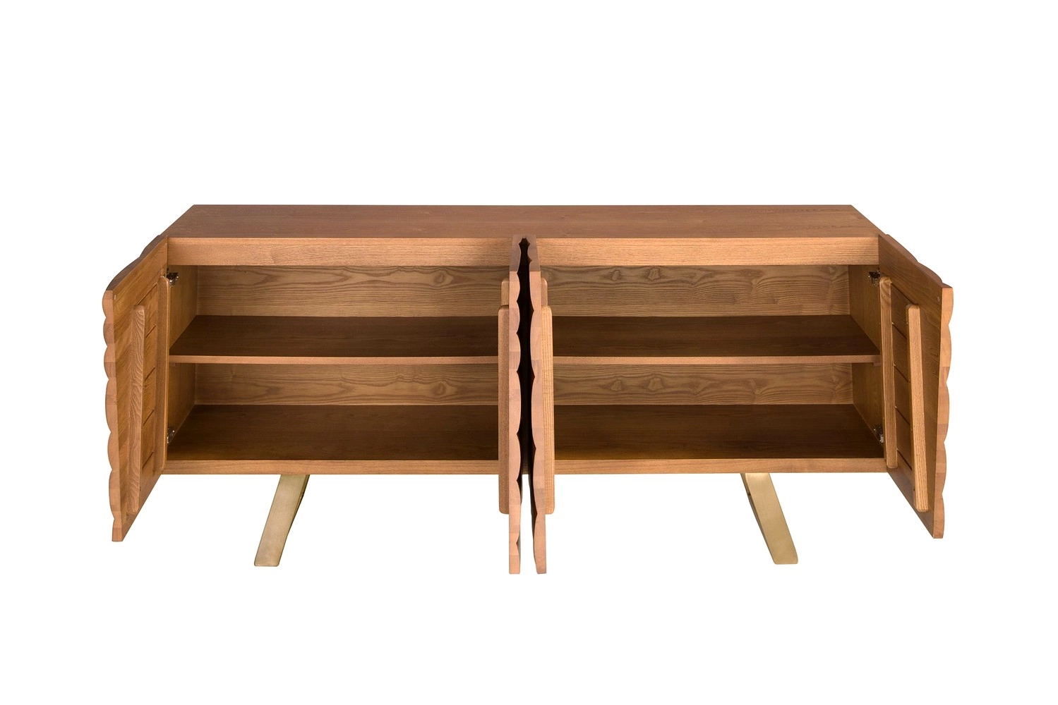 Pés originais em aço inoxidável polido com acabamento dourado. Dispõe de arrumação com 4 portas em madeira cor nogueira clara,