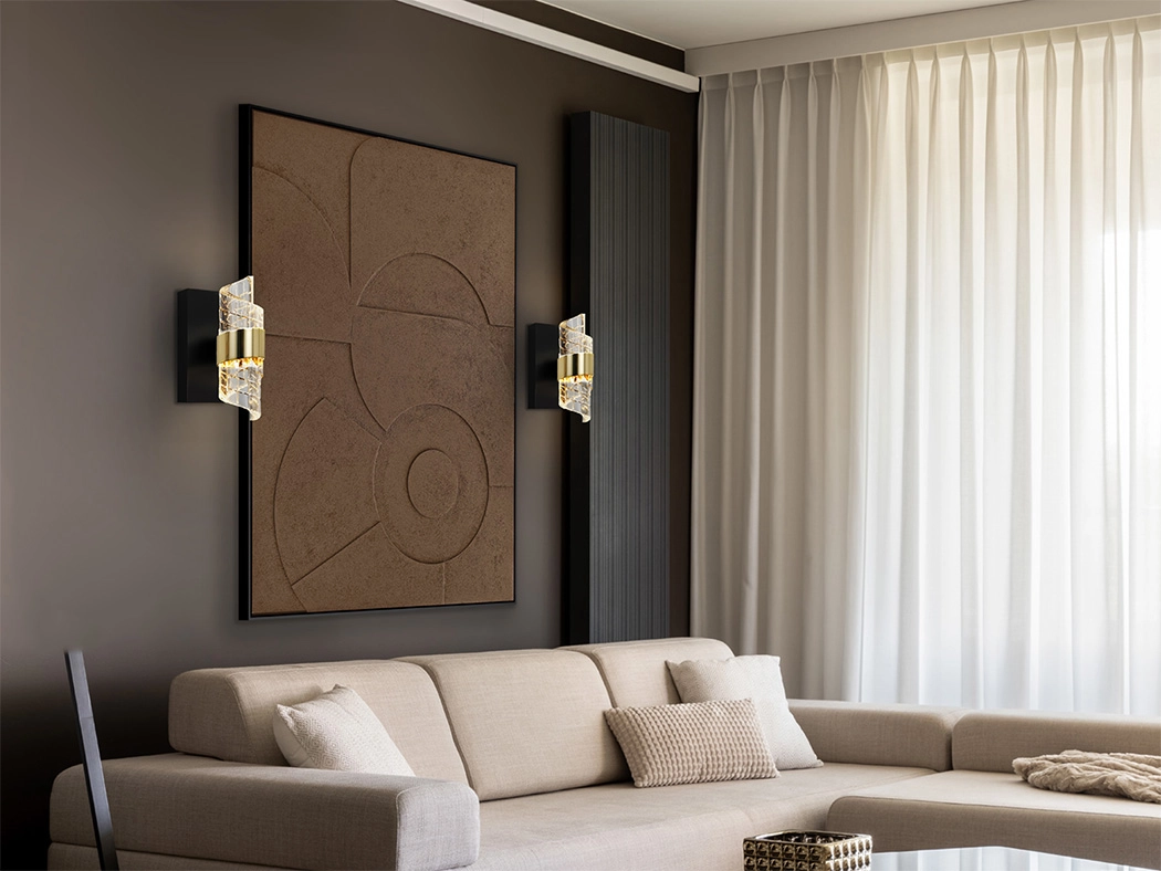 Candeeiro de parede de 1 luz LED. Realizado em metal, acabamento preto mate e dourado brilhante. Abajur com design em espiral, realizado em acrílico moldado e esculpido.