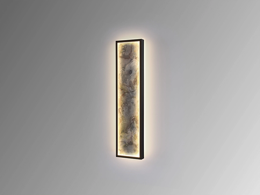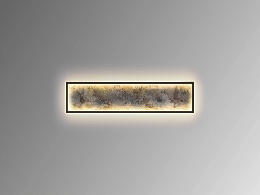 Candeeiro de parede ou de teto retangular. Candeeiro realizado em metal com acabamento preto e ardósia multicolorida, com moldura em acrílico opalino.