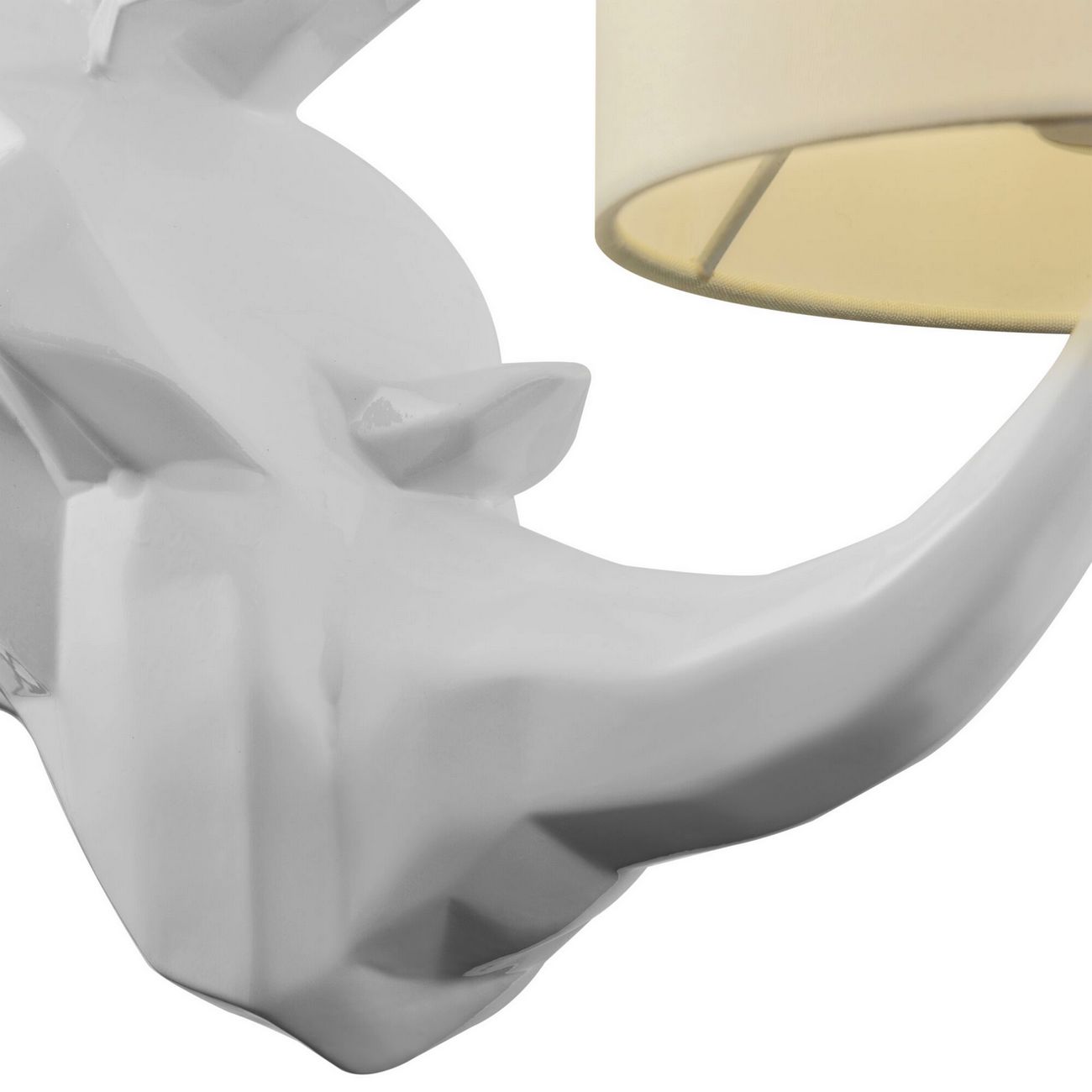 A estrutura poligonal do modelo, frequentemente usada na modelagem volumétrica, foi transferida para um material moderno e durável - a poliresina. O resultado é um novo visual decorativo. A figura de um rinoceronte serve de base. O abajur é feito de tecido de algodão revestido com PVC. Os modelos da série são apresentados em branco e preto de alto brilho. Um abajur e arandelas de parede em dois tons se tornarão um destaque espetacular na iluminação de zona de um interior moderno.