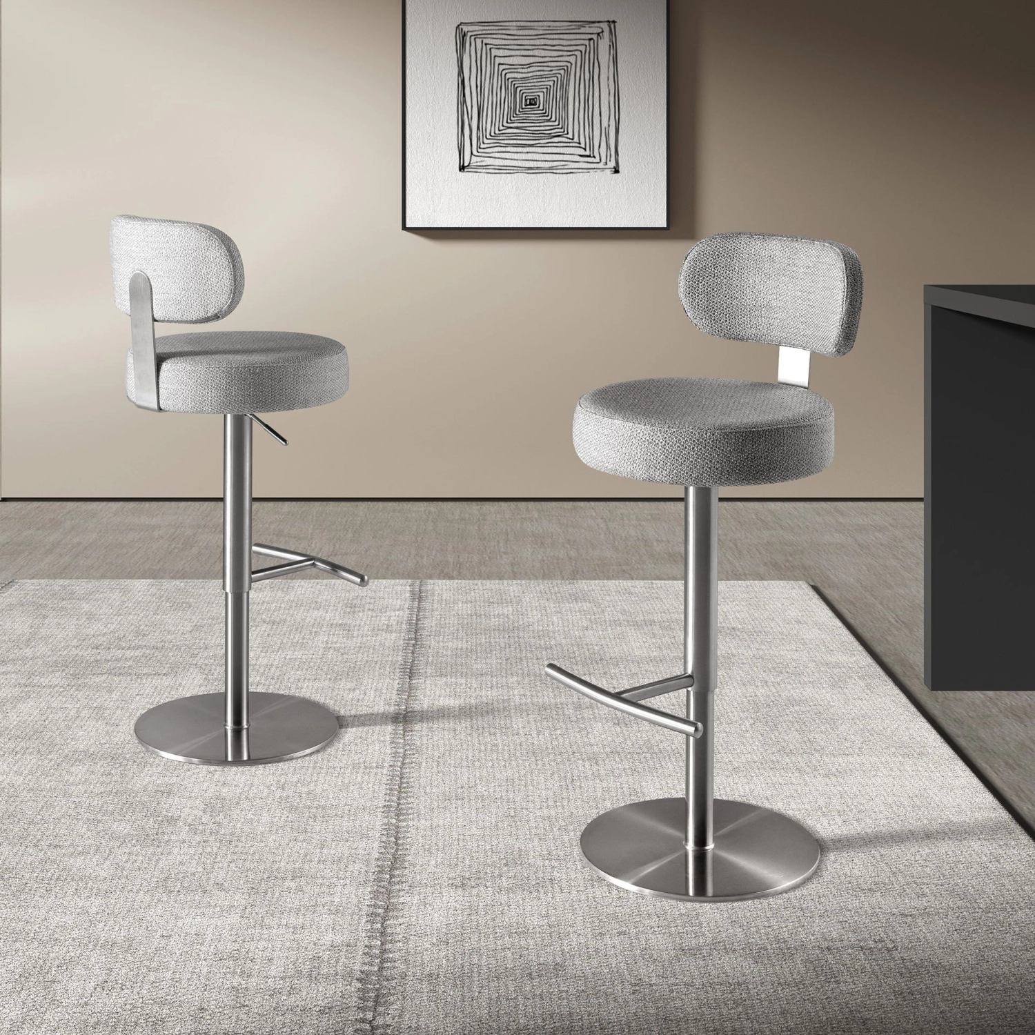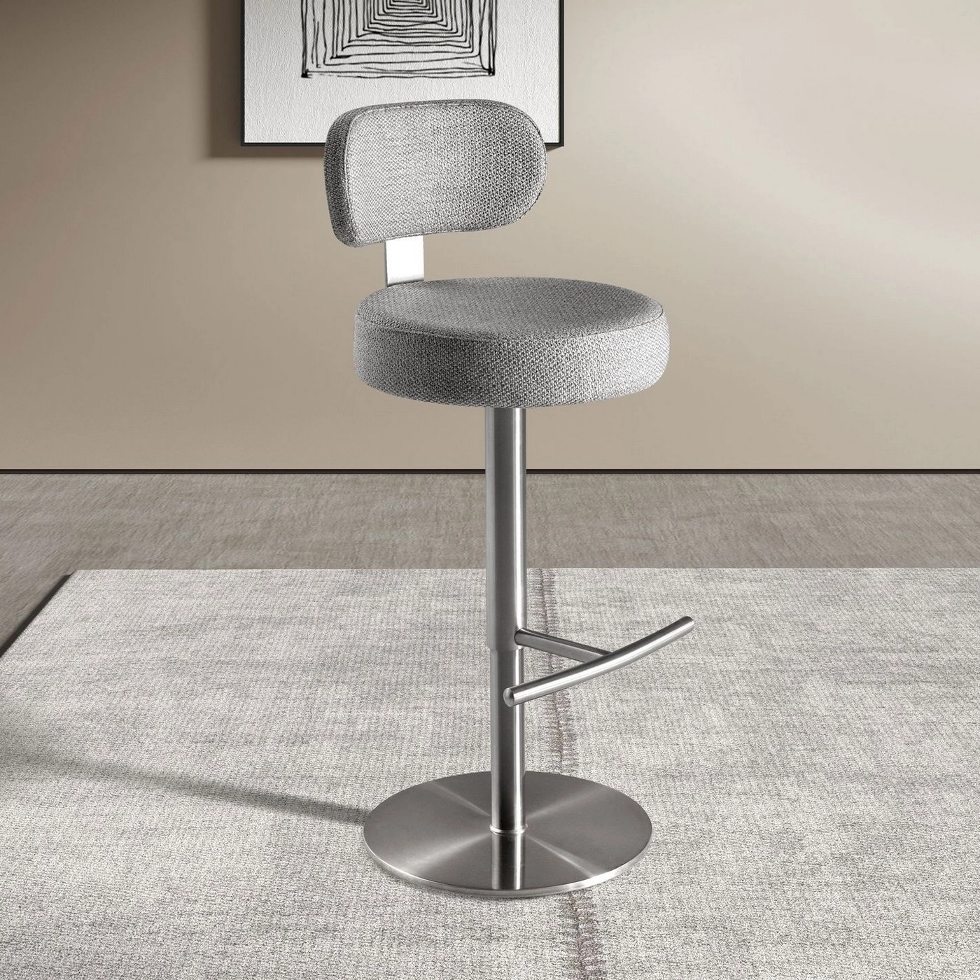 Assento e encosto estofados em tecido cinza claro mesclado.