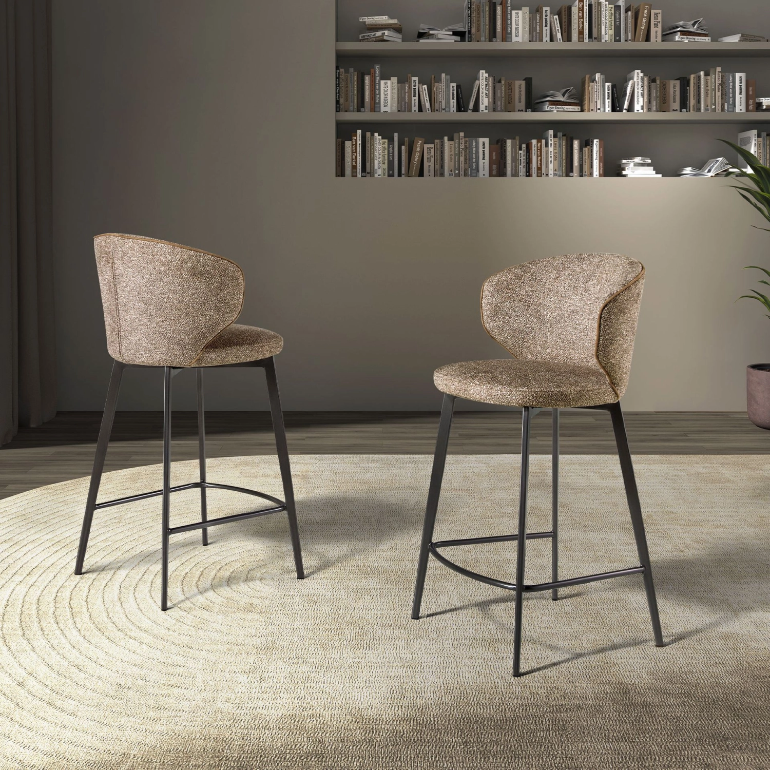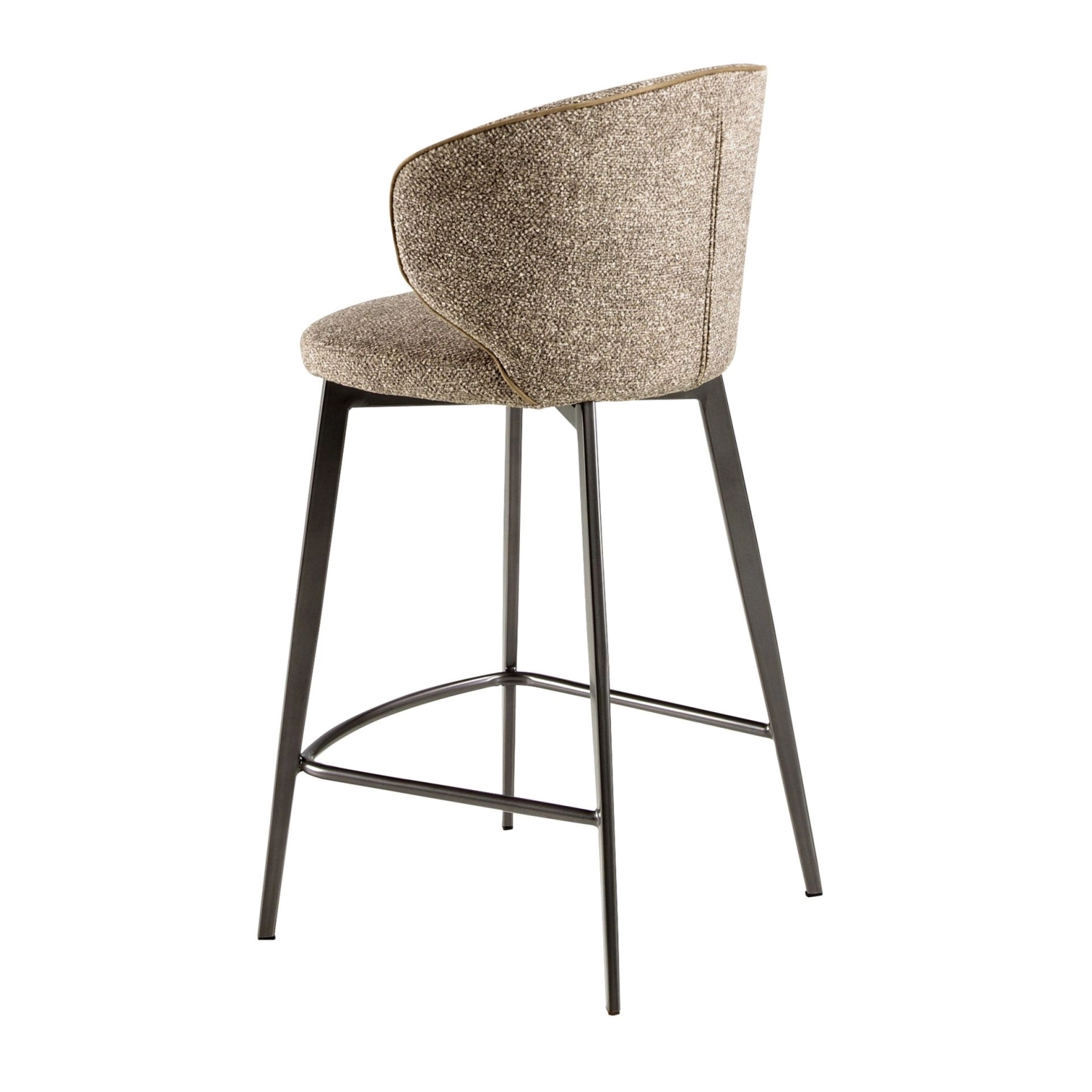 Banco de ilha Morvil com assento e encosto estofados em tecido castanho mesclado.