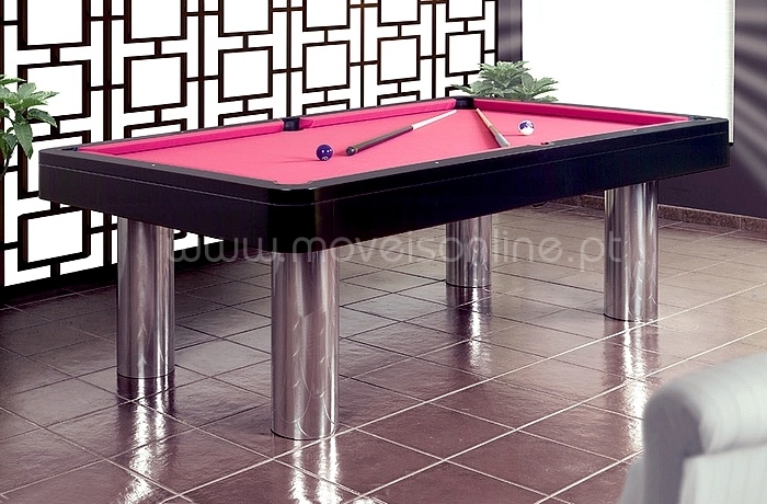 Medida exterior: C 245 X L 135 X A 80 cmÁrea de jogo: C 220 X L 110 cmÉ possível fazer com outras medidas internacionais.Materiais: Estrutura em ferro revestida a madeira e tabuleiro em ardósia.Oferta: 8 tacos e suporte, bolas, giz, triângulo e escova.