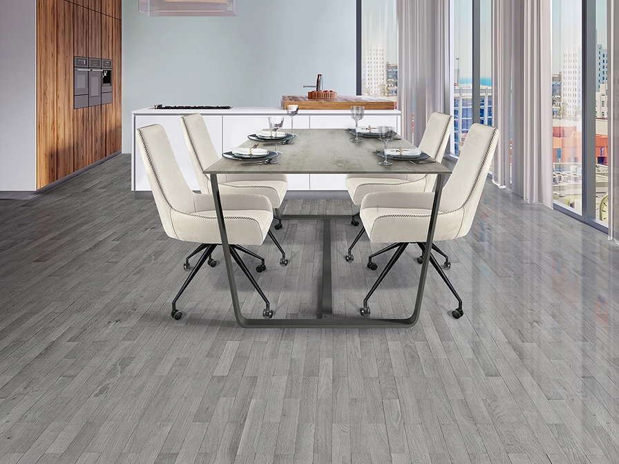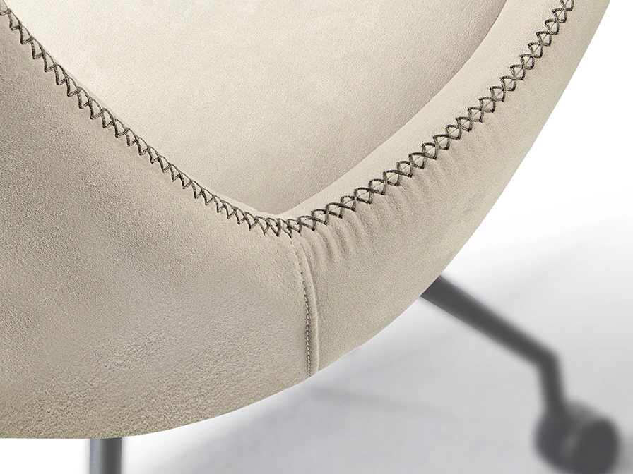 Estofo em tecido com cor branca, com pesponto decorativo em cinzento.