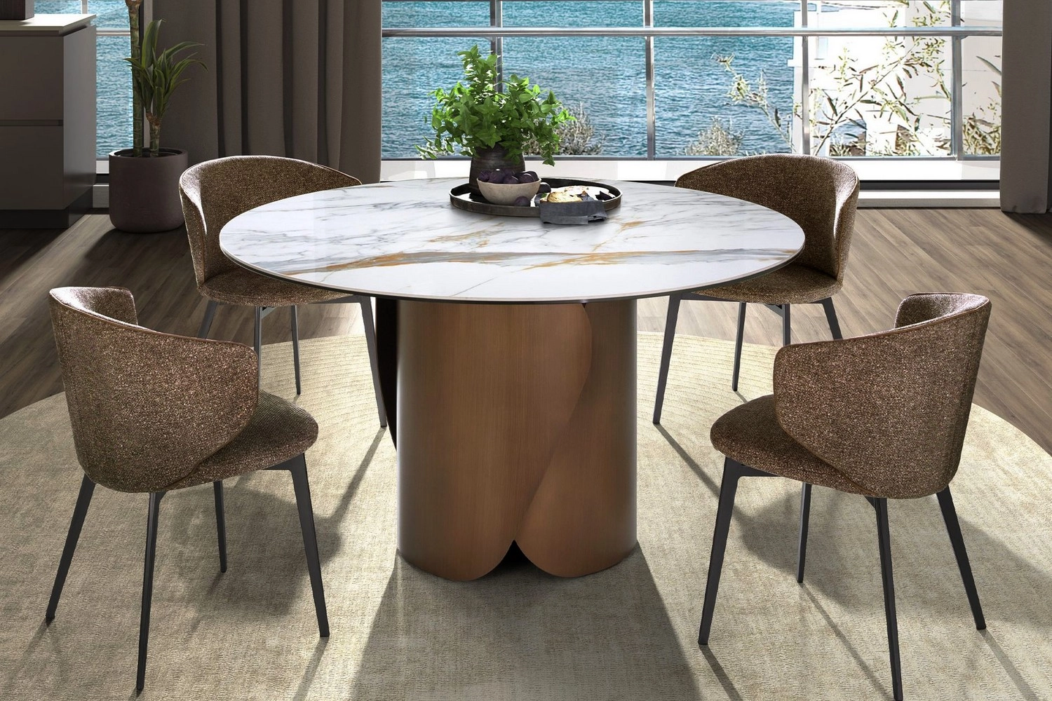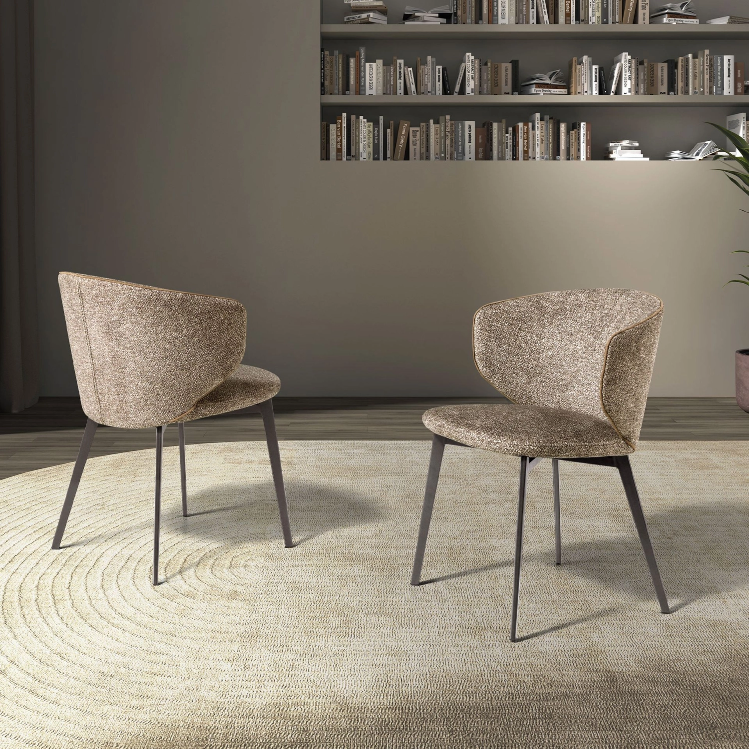Cadeira de design Morvil com assento e encosto estofados em tecido castanho mesclado.