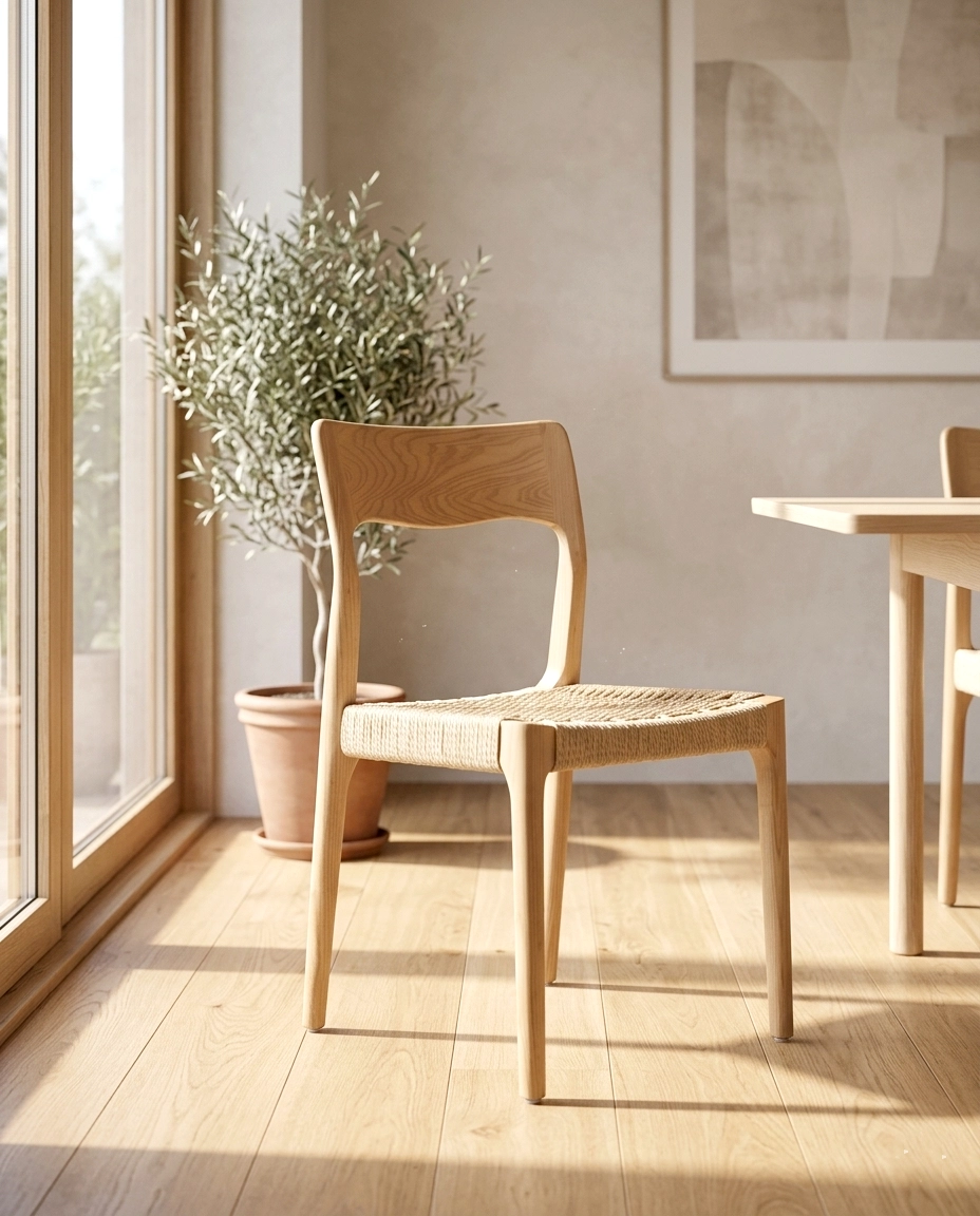 Cadeira nórdica com estrutura em madeira e assento trançado que combina simplicidade e conforto. O design simples valoriza qualquer mesa de jantar e cria um ambiente acolhedor e contemporâneo. Assento ergonómico proporciona apoio natural nas refeições prolongadas enquanto o acabamento em madeira adiciona calor e carácter ao espaço. Excelente opção entre cadeiras sala jantar que privilegiam o estilo nórdico. Versátil e leve, é fácil de mover e posicionar em salas, cozinhas e áreas de convívio, oferecendo manutenção prática com limpeza simples. Escolha ideal para quem procura estética minimalista sem abdicar de conforto e funcionalidade.