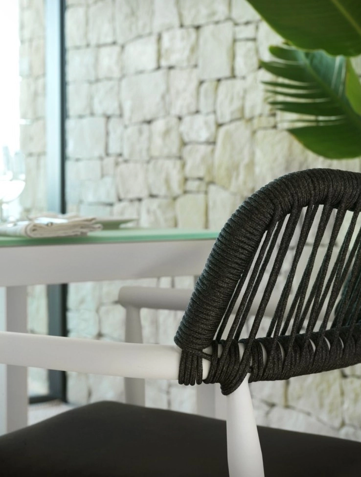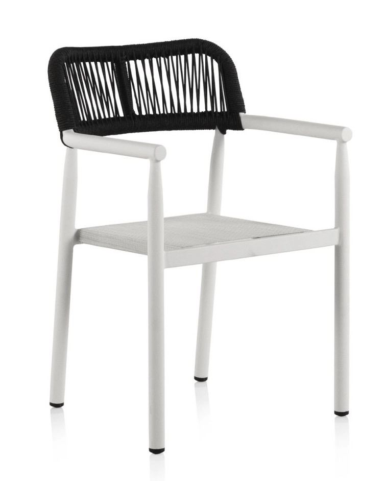 Cadeirão de alumínio cor branca, entrançado em corda sintética cinzenta e almofada em tecido Onyx resistente a descoloração e repelente a água