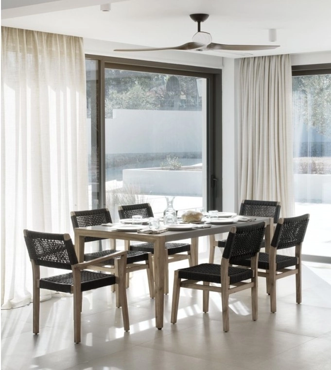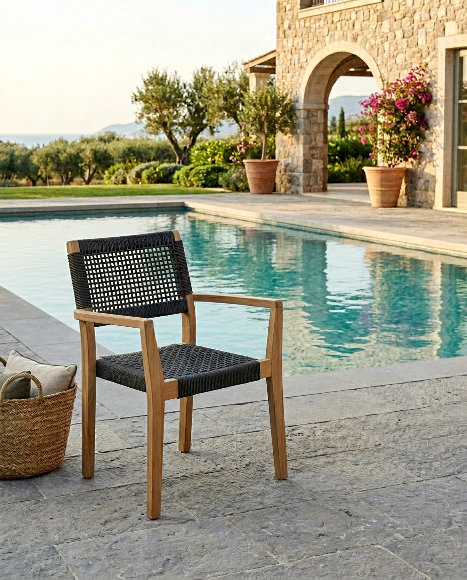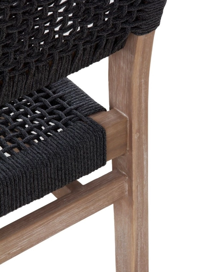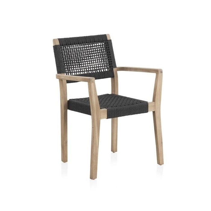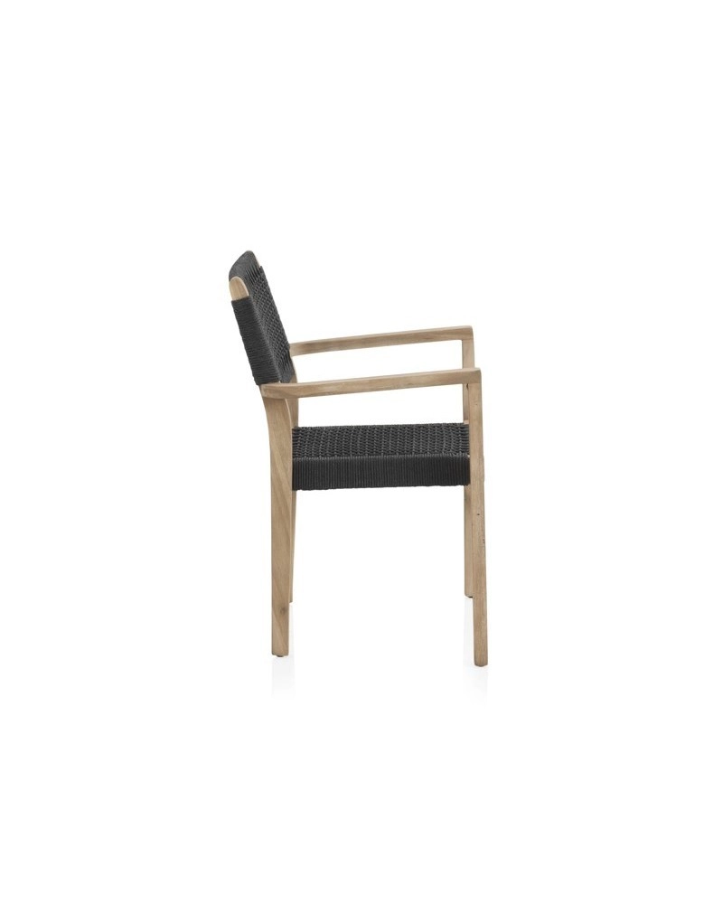Cadeirão em madeira de acácia com acabamento ligeiramente patinado e entrelaçado com corda sintética cor cinzento carvão.