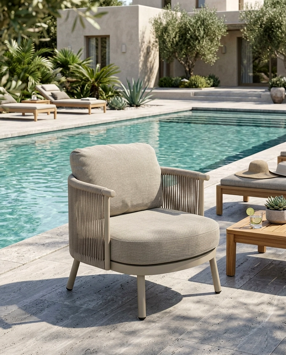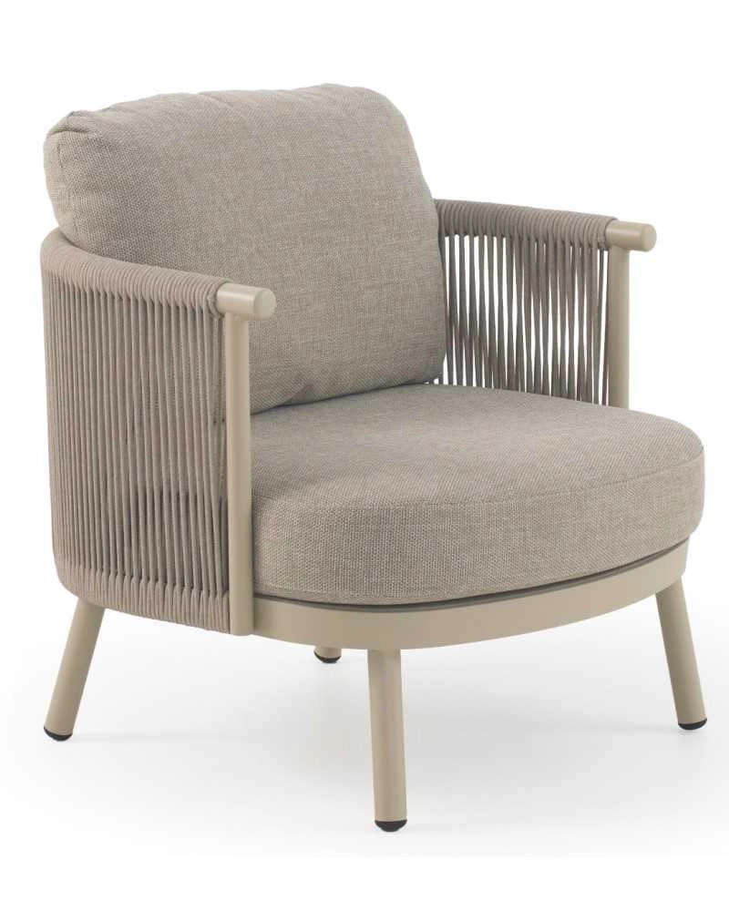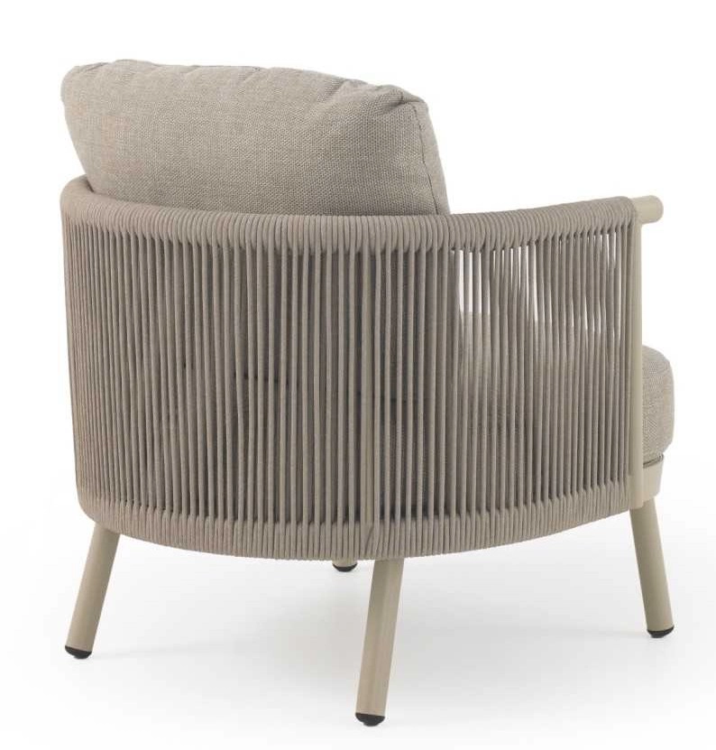 Poltrona de alumínio, entrançado em corda cor de areia com almofadas.