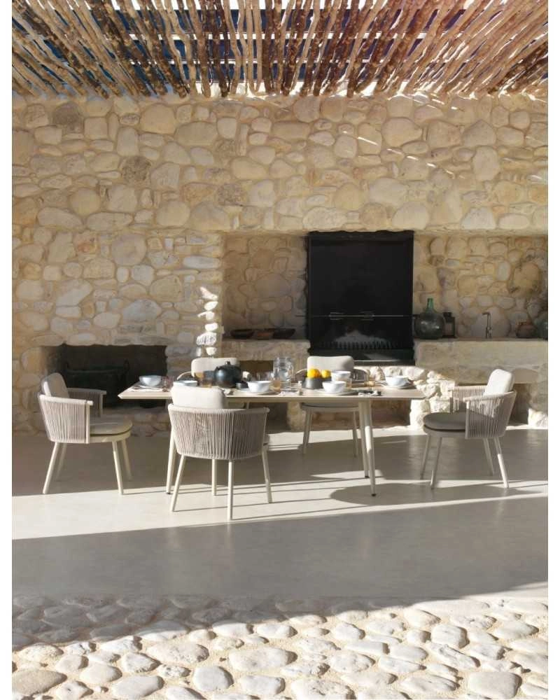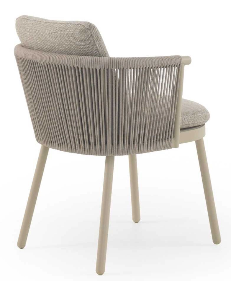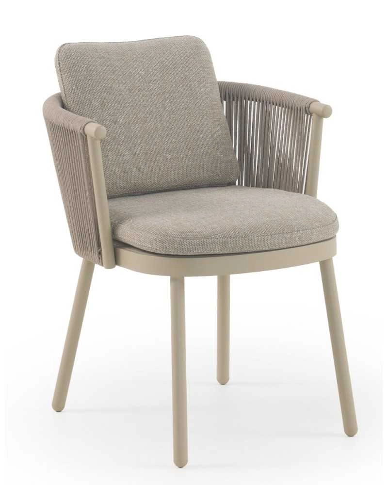 Cadeirão de alumínio cor areia, entrançado em corda sintetica cor de areia com almofadas.