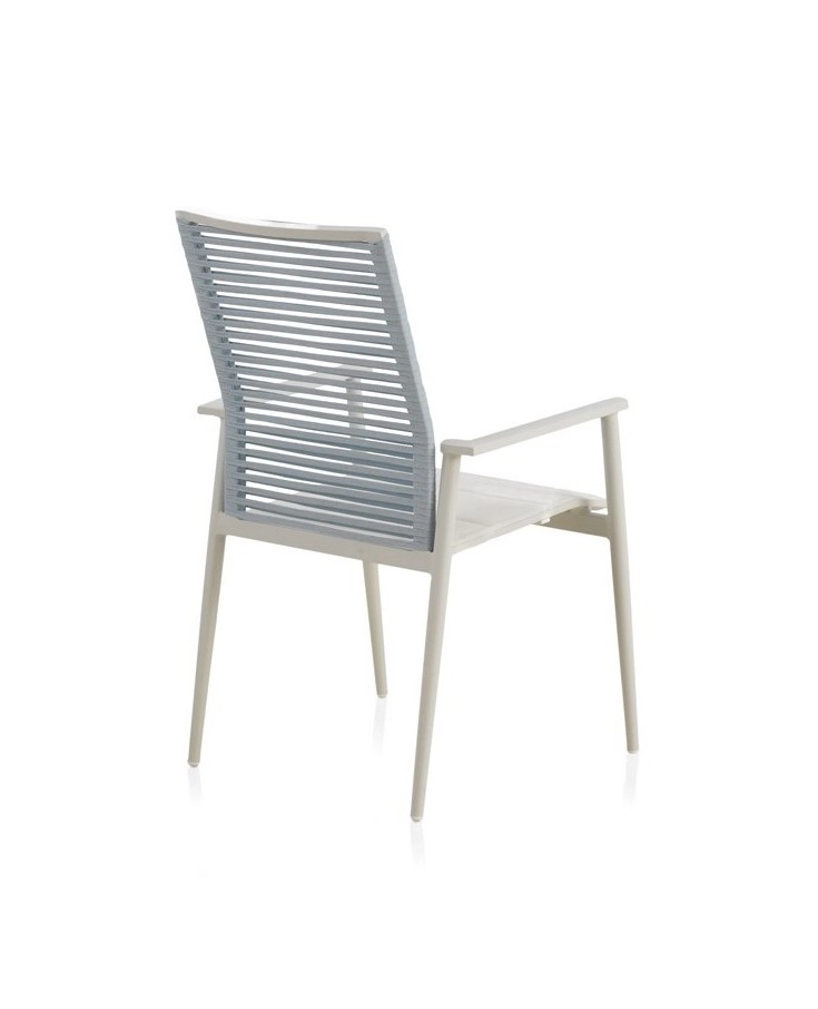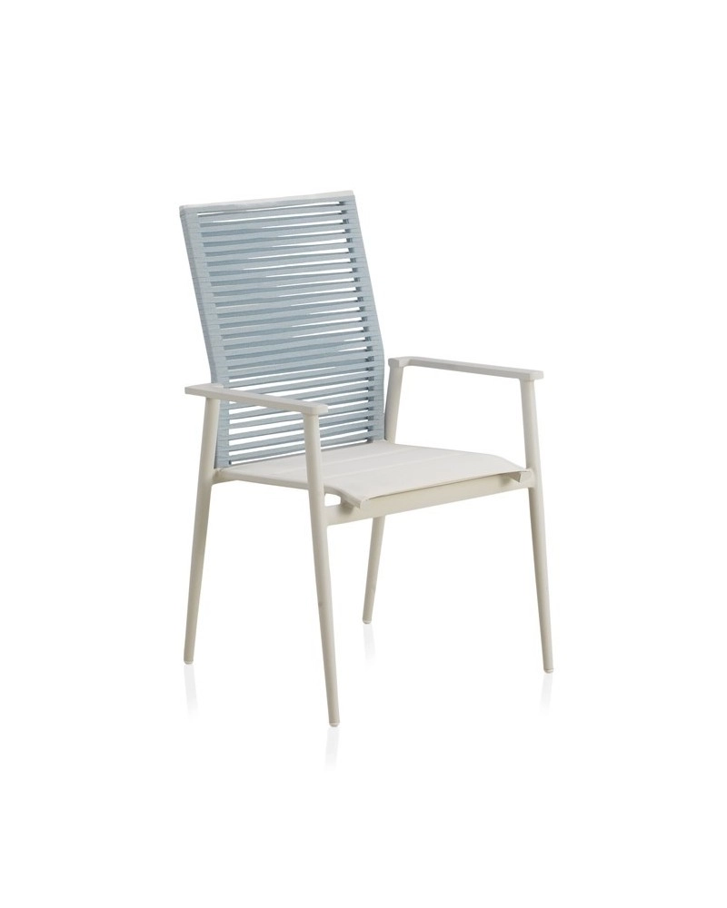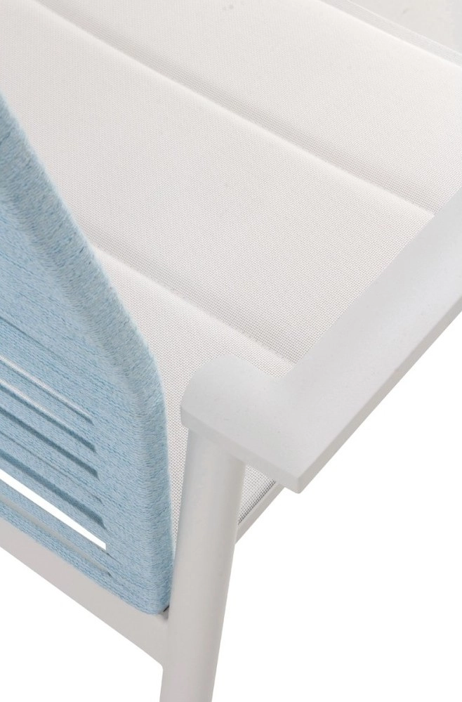 Cadeirão de alumínio cor branca, entrançado em corda sintética cor azul celeste com assento branco.