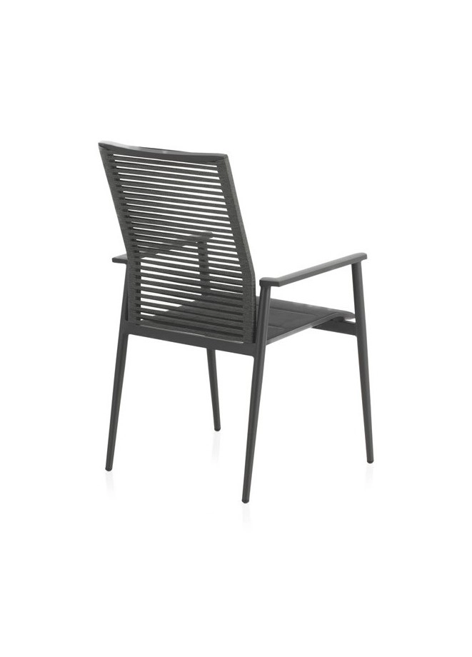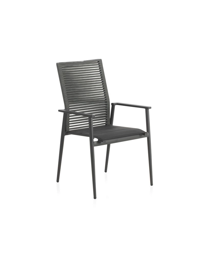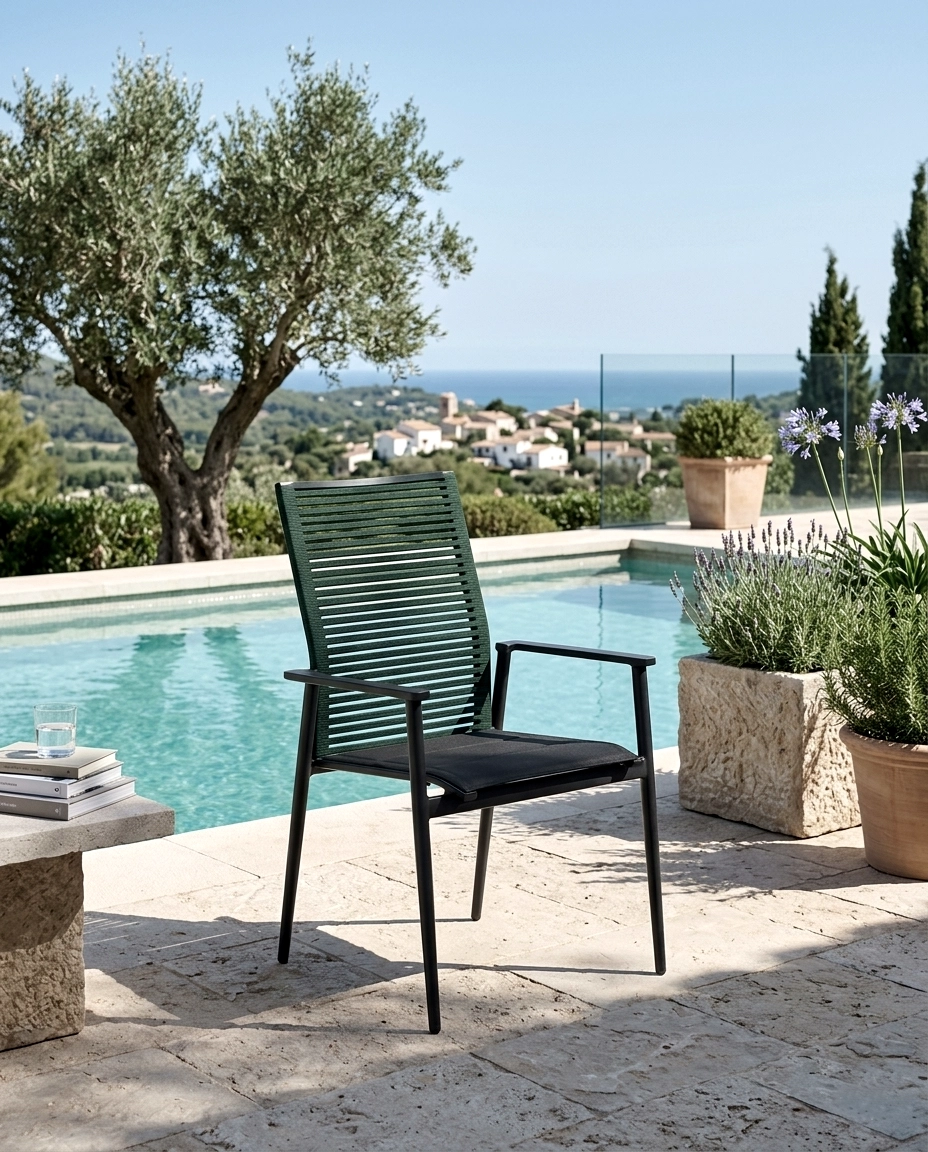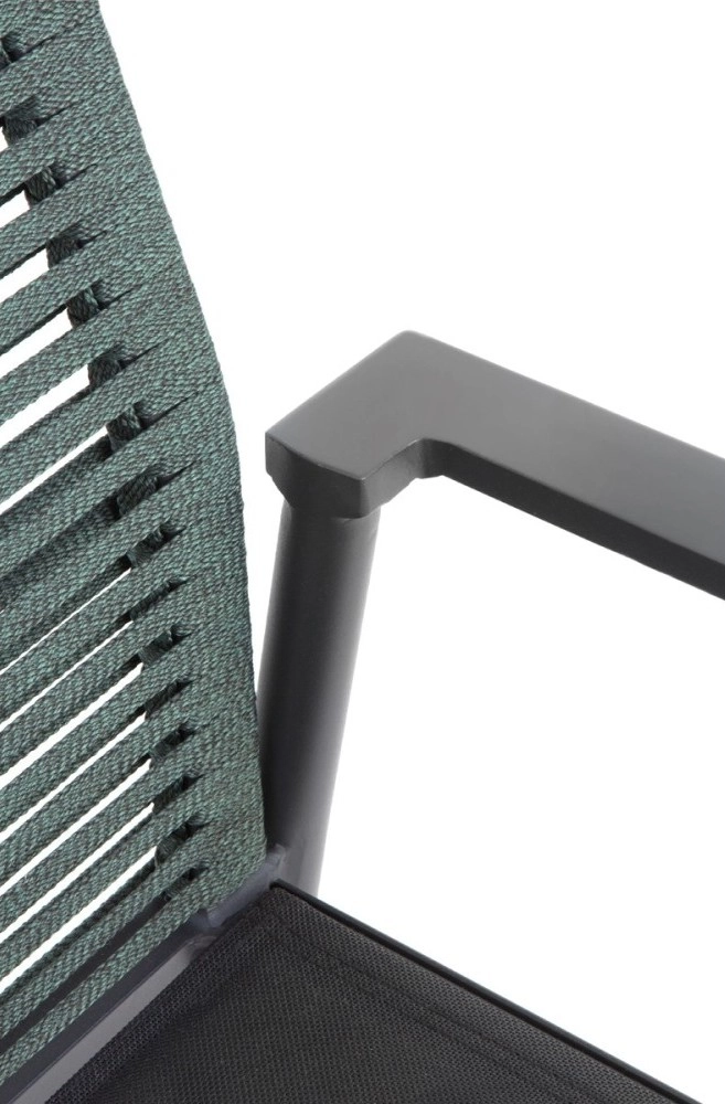 Cadeirão de alumínio cor cinzento carvão, entrançado em corda sintética cor verde escuro e assento cinzento carvão.
