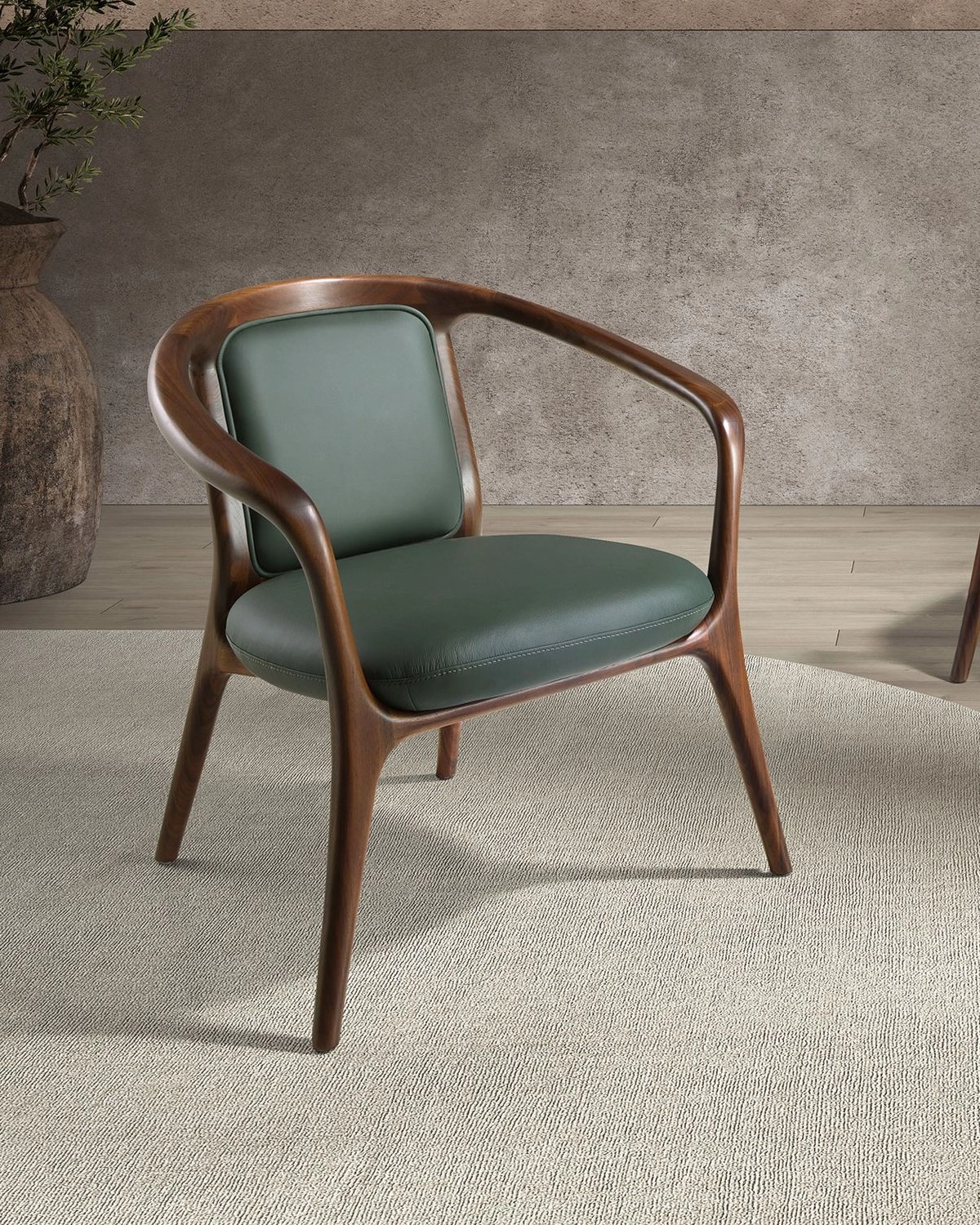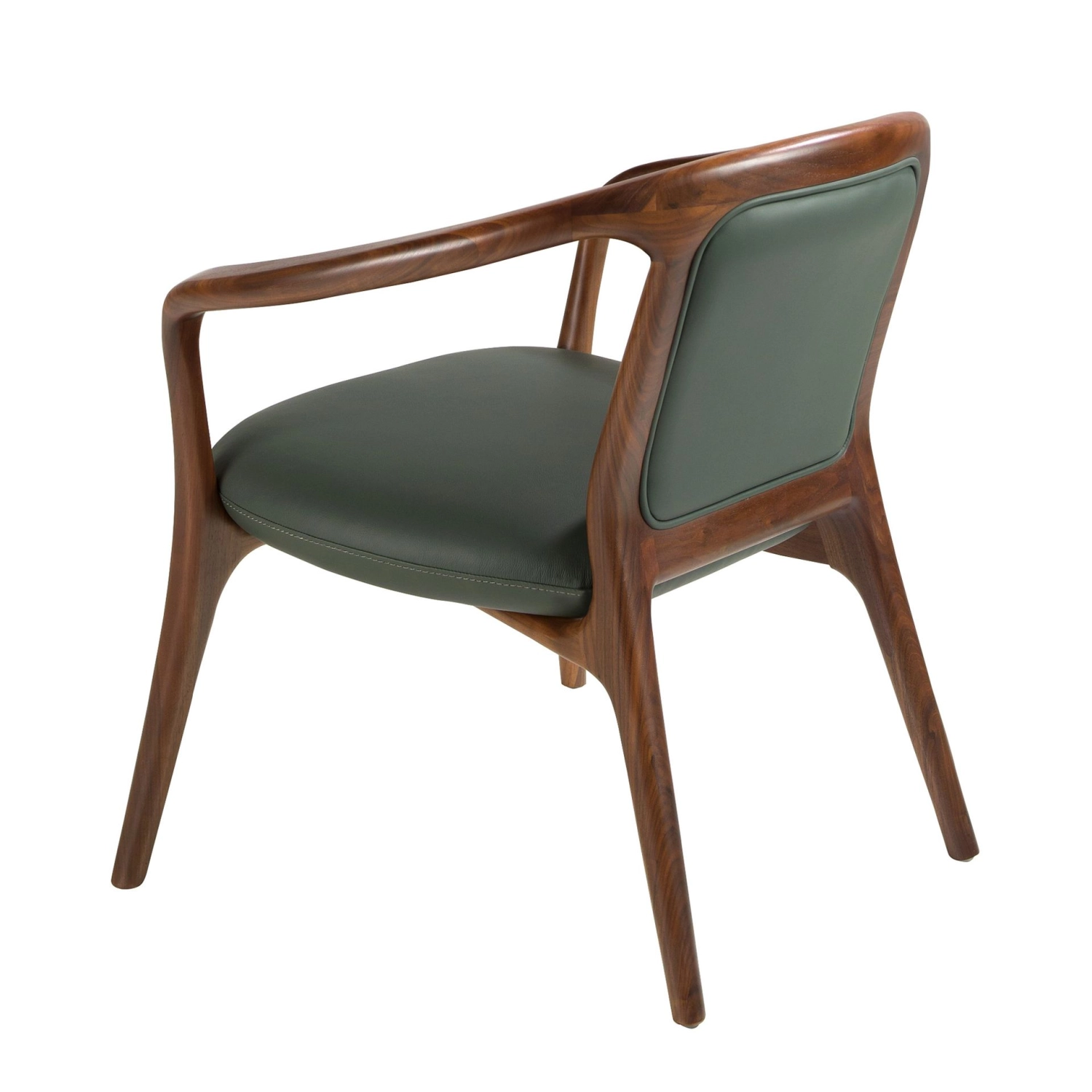Assento e encosto estofados em pele sintética verde escuro.