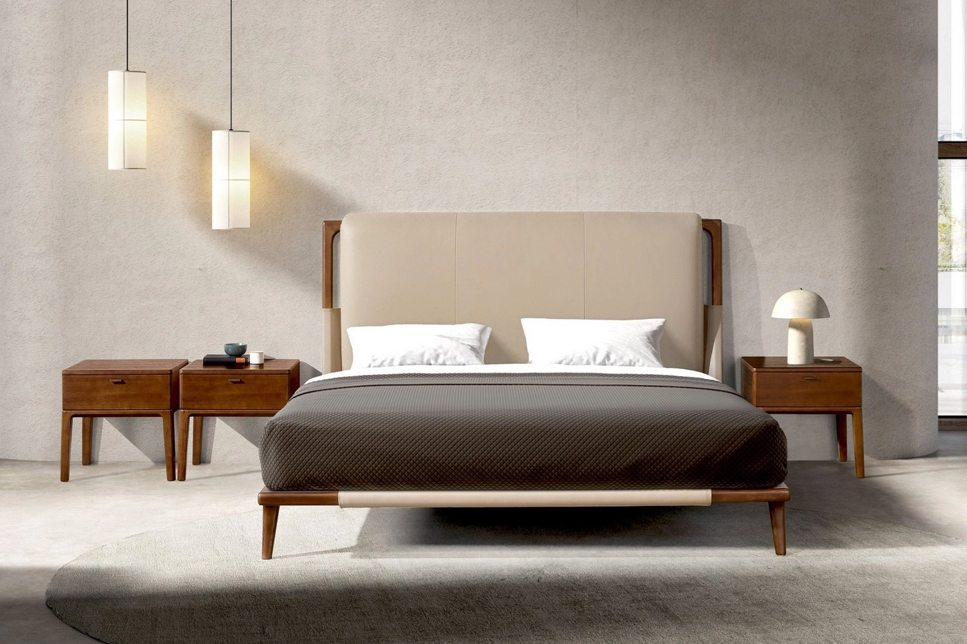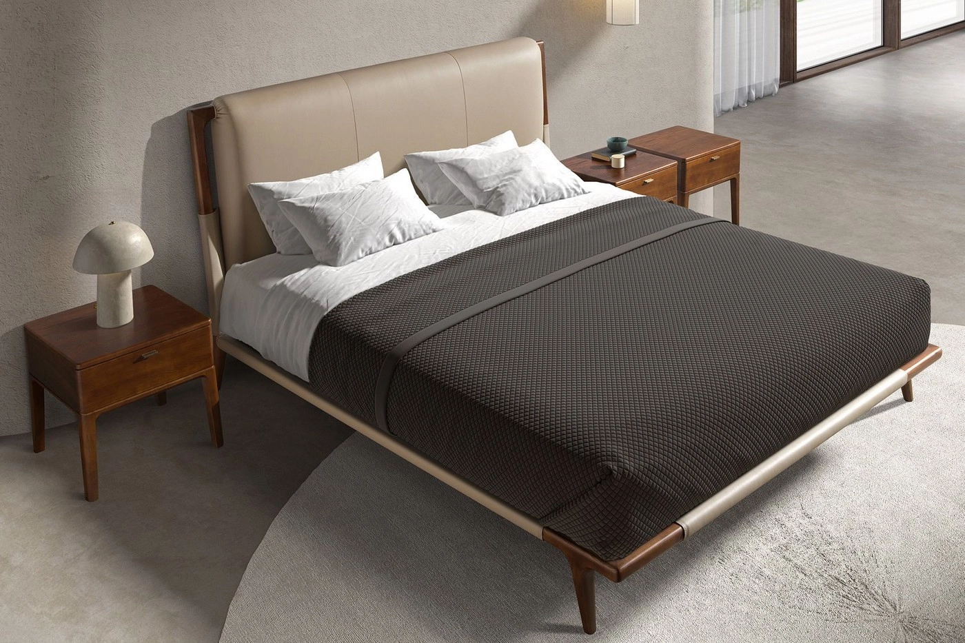 Cama de casal London com uma cabeceira original em pele sintética cor de vison.