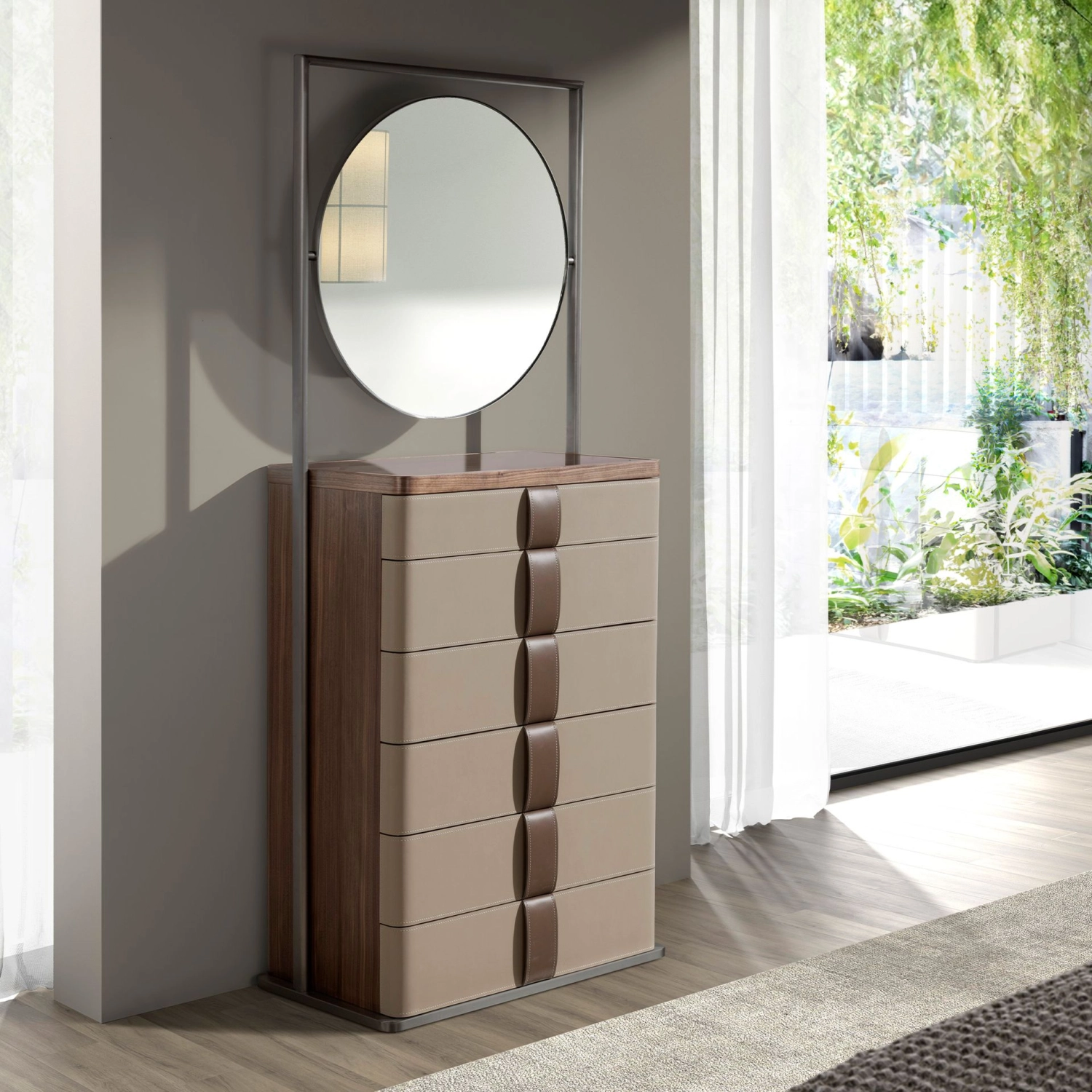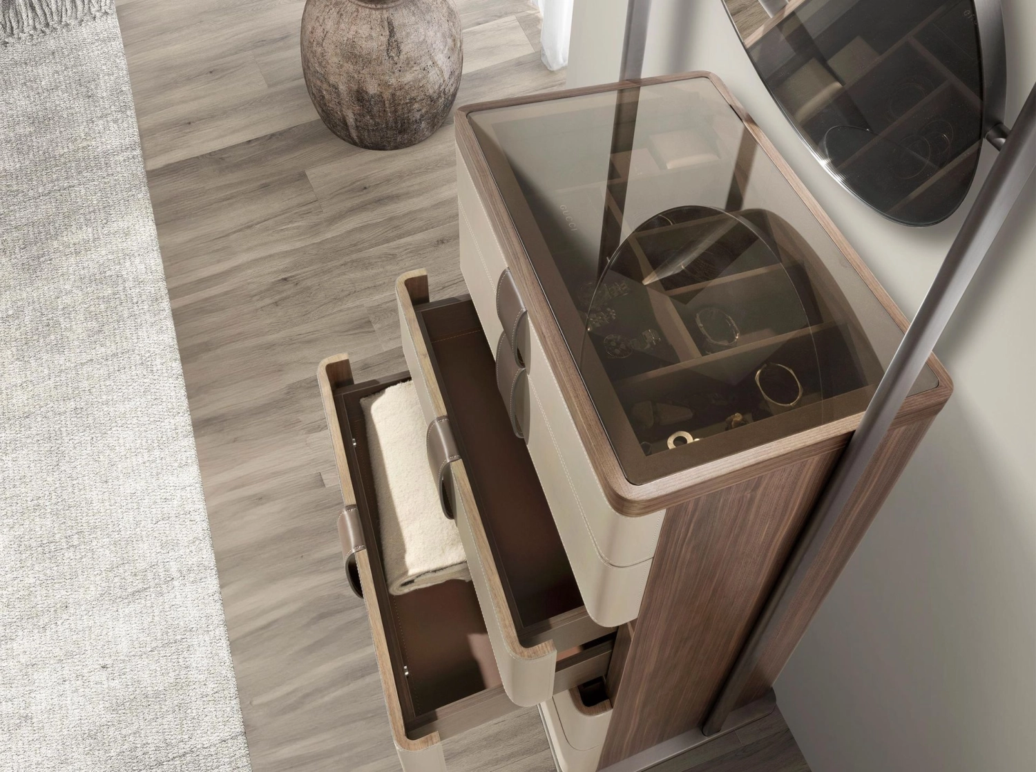Camiseiro alto Delia de design moderno com estrutura em folha de madeira natural de nogueira.