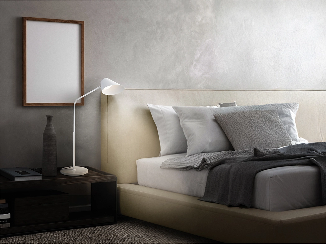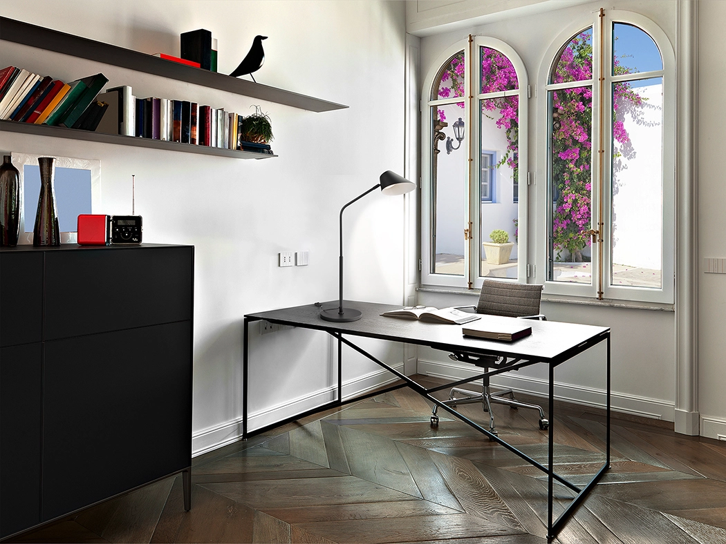 Candeeiro de secretária, realizado em metal e alumínio, acabamento preto ou branco mate, difusor opalino.