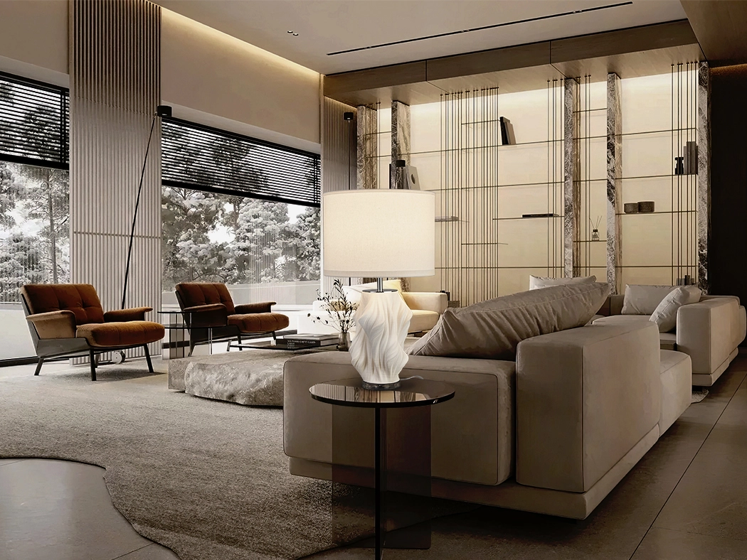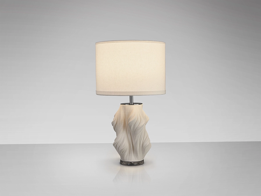 Candeeiro de mesa em cerâmica com acabamento branco, metal com acabamento cromado.
