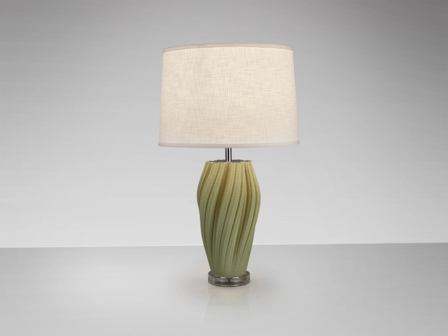 Candeeiro de mesa em cerâmica com acabamento verde claro, metal com acabamento cromado.