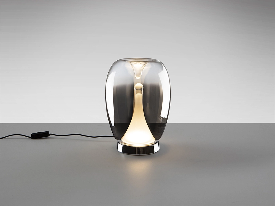Candeeiro de secretária realizado em alumínio cromado, com abajur de vidro soprado com acabamento smoke ou âmbar degradê e difusor interior opalino.