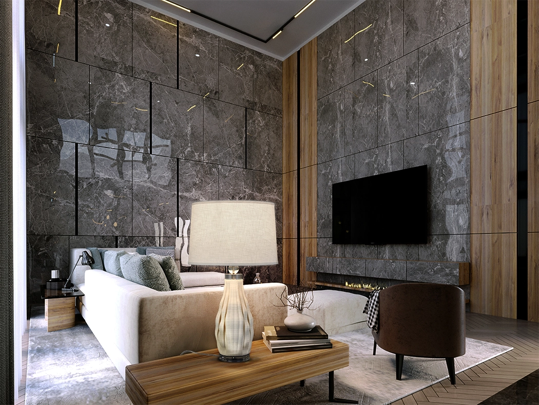 - Base com acabamento marmoreado em tons neutros