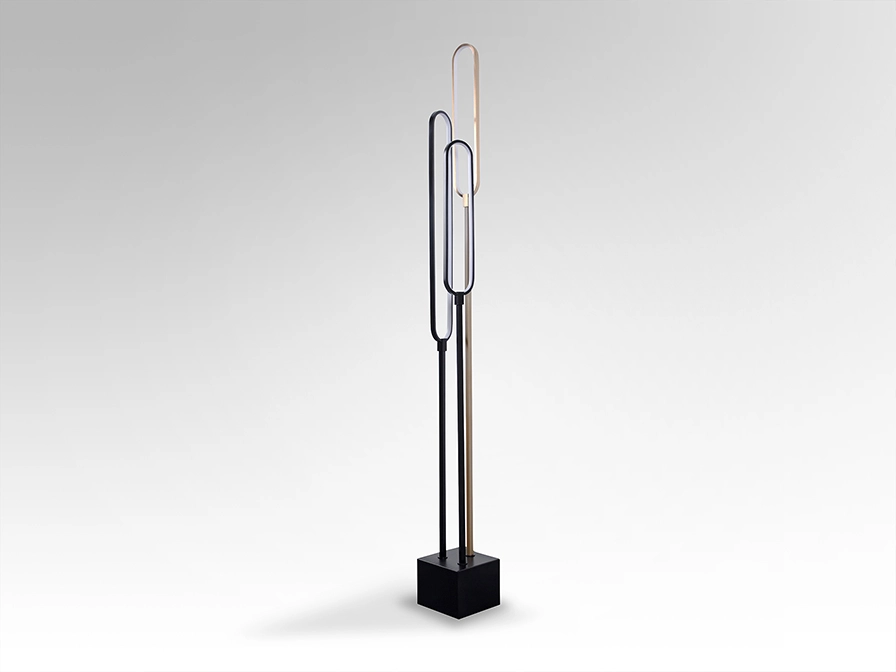 Candeeiro de pé com 3 luzes LED, fabricado em alumínio escovado e base em metal.