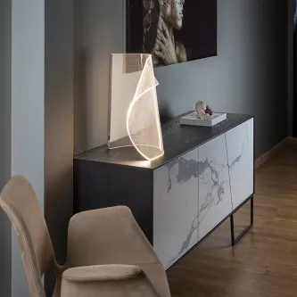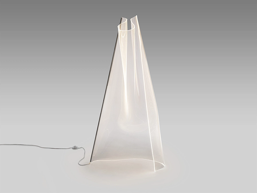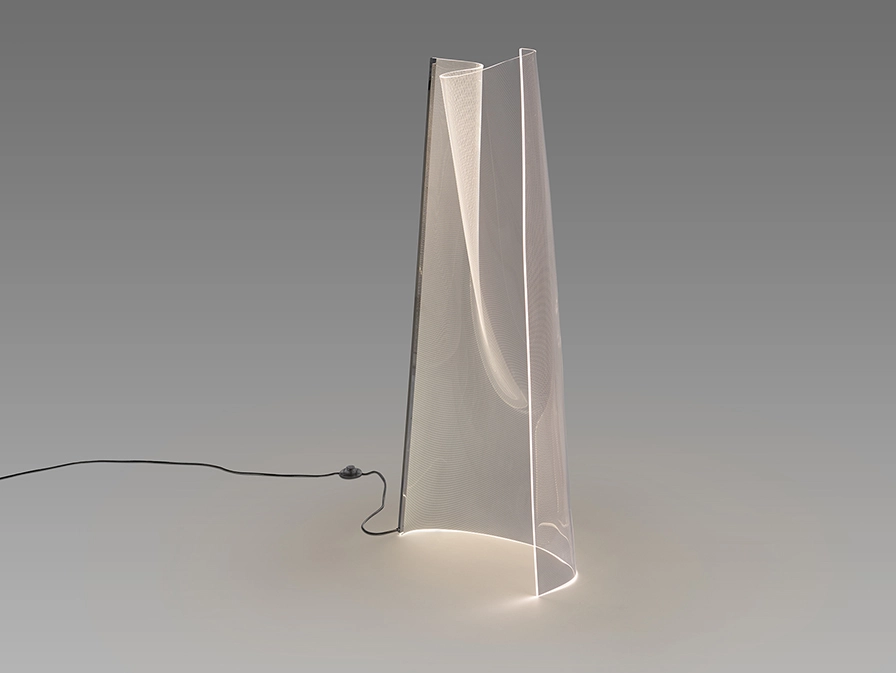 Candeeiro de pé formado por uma lâmina de metacrilato microimpresso moldado e perfil metálico cromado.