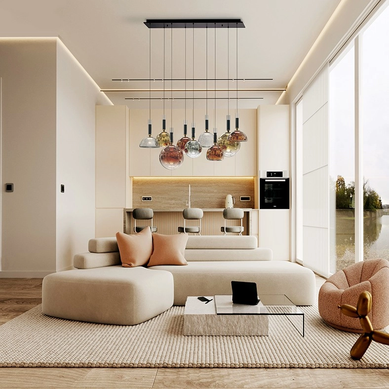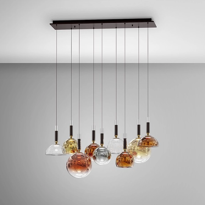 Candeeiro de 9 abajures de vidro com banho eletrolítico em tons cobre, dourado, prateado e transparente , realizado em alumínio escovado, acabamento em tom bronze escuro.