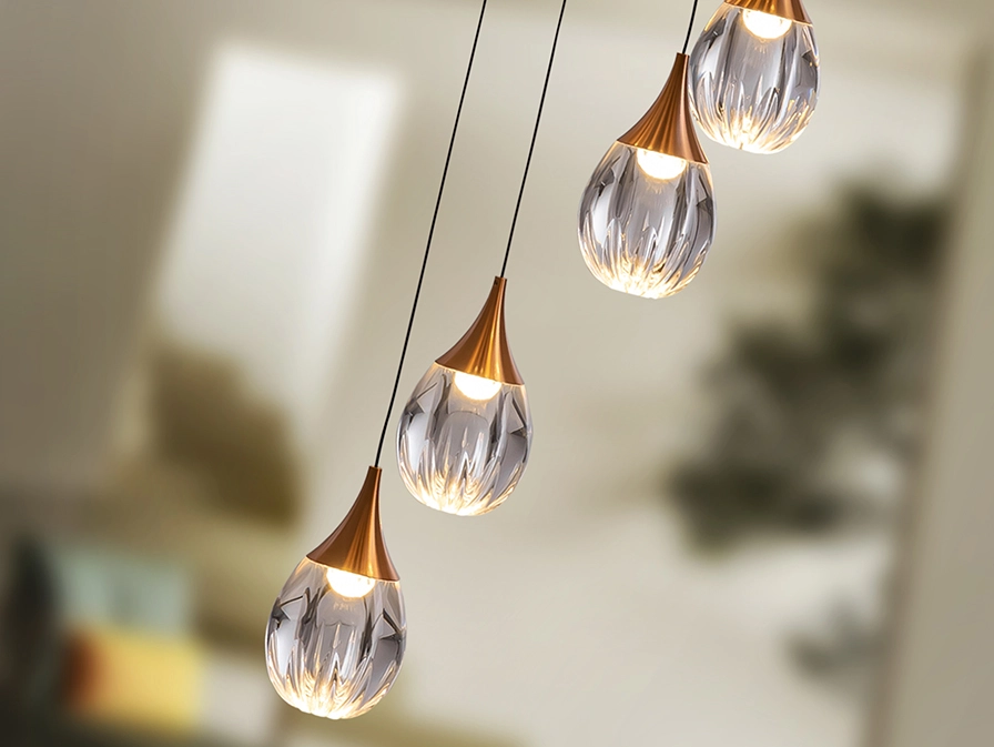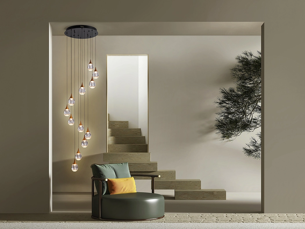 O candeeiro de teto corina 12l destaca se por um conjunto de 12 luzes suspensas em diferentes alturas que criam um efeito cascata elegante e contemporâneo. Cada ponto de luz transforma o ambiente em foco visual ao mesmo tempo que proporciona uma iluminação ambiente acolhedora ideal para salas, halls de entrada e escadas com pé direito elevado. A base discreta no teto deixa as suspensões em evidência conferindo um aspeto leve e sofisticado à divisão.