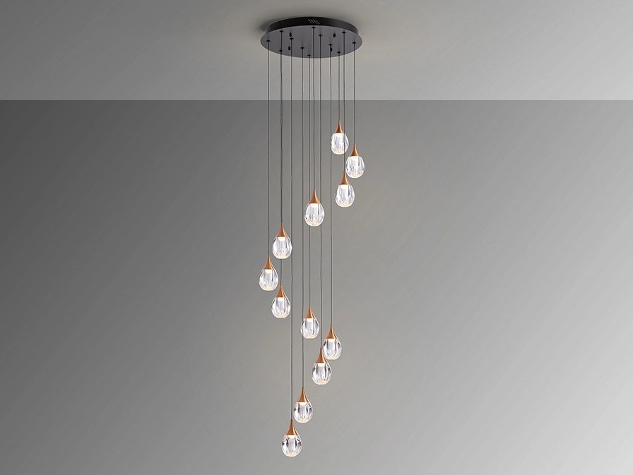 Candeeiro de 12 luzes realizado em metal com acabamento preto mate e detalhes em cobre. Abajures moldados em acrílico transparente.