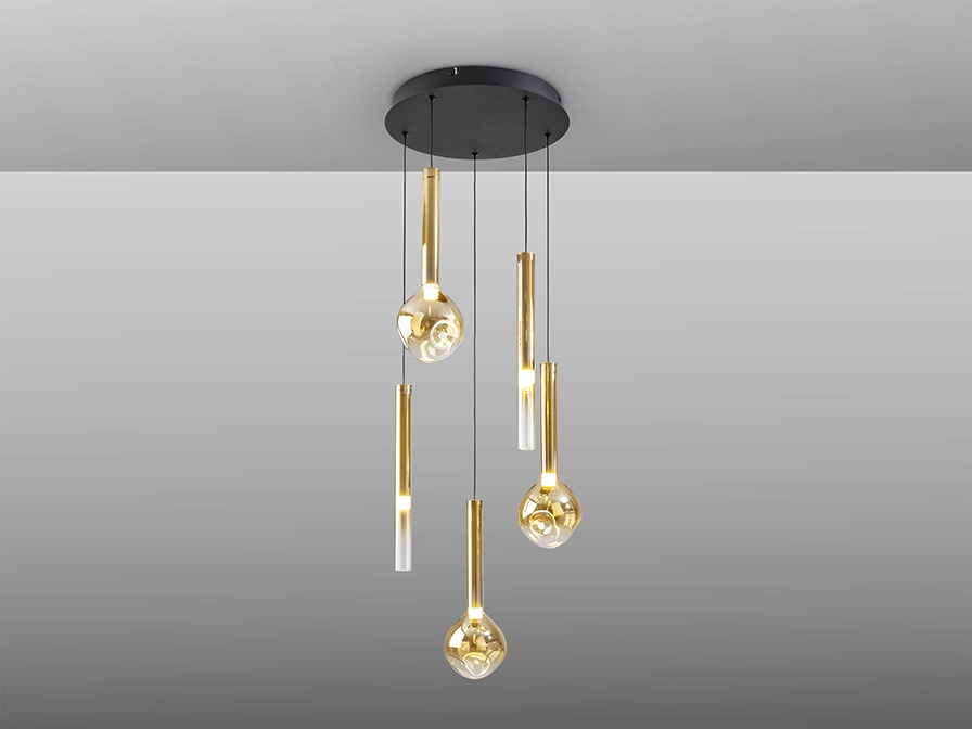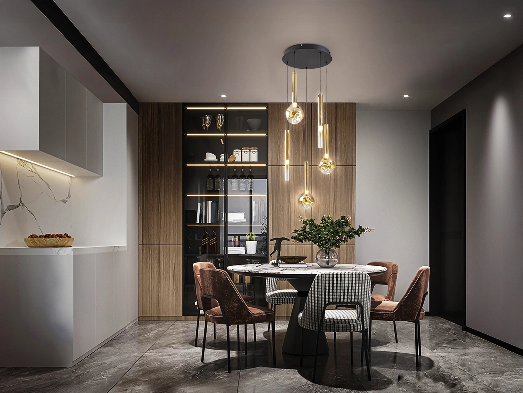 Na sala de jantar o ideal é que fique centrado sobre a mesa de jantar. A altura correta é crucial: cerca de 75 a 90 cm acima do tampo da mesa para não bloquear a visão nem encandear.