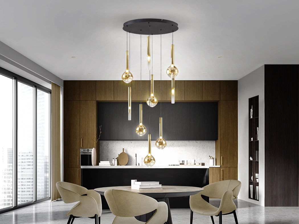 candeeiro de teto essenza 9l apresenta um design contemporâneo com nove pontos de luz suspensos por cabos de comprimentos variados, combinação perfeita entre funcionalidade e decoração. Esferas de vidro e elementos metálicos com acabamento dourado criam um efeito elegante que realça mesas de jantar e ilhas de cozinha. A disposição escalonada das luminárias promove iluminação equilibrada e um ambiente acolhedor, ideal para receber ou relaxar. Peça central que valoriza interiores modernos, adicionando personalidade sem sobrecarregar o espaço. Facilidade de integração em diferentes estilos graças ao seu visual versátil e sofisticado.