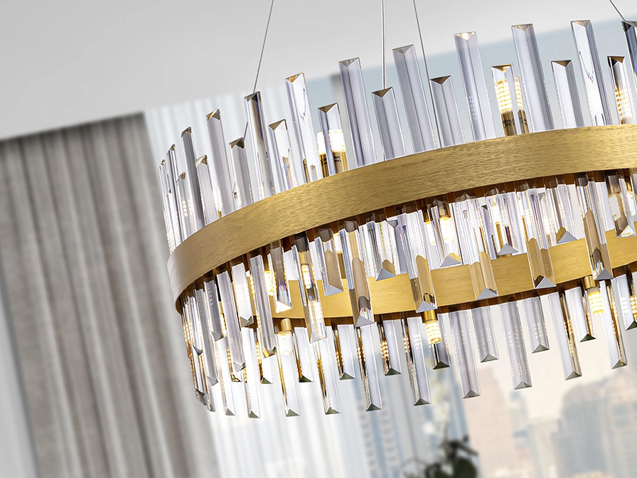 Candeeiro redondo de 18 luzes, realizado em metal escovado acabamento dourado.