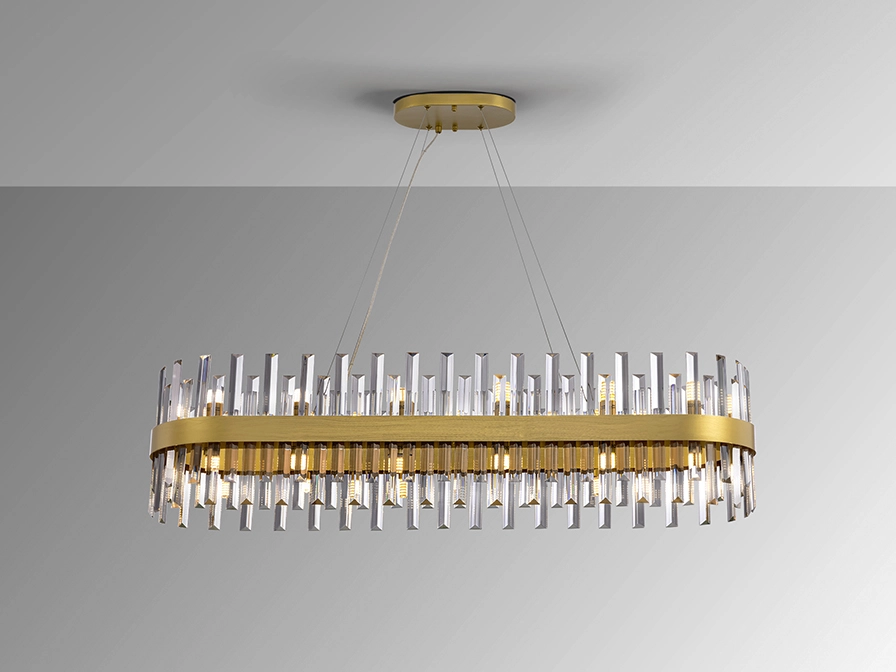 Candeeiro oval de 28 luzes, realizado em metal escovado acabamento dourado.
