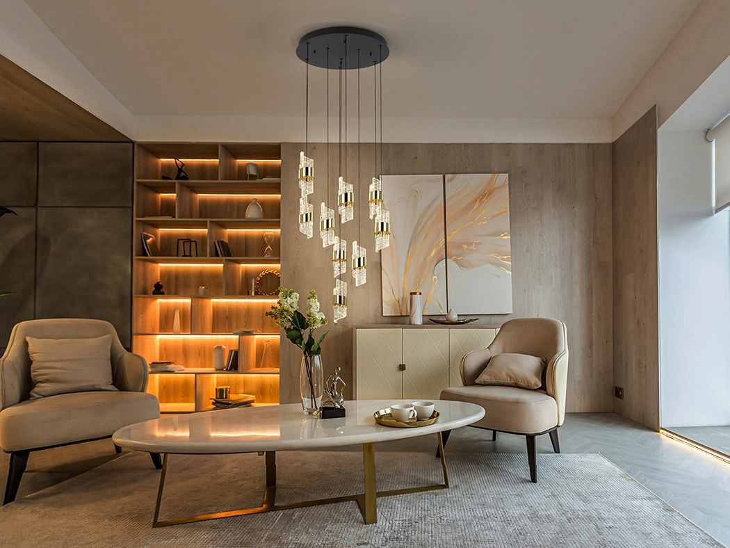 Candeeiro de 9 luzes LED. Realizado em metal, acabamento preto mate e dourado brilhante. Abajures com design em espiral, realizados em acrílico moldado e esculpido.
