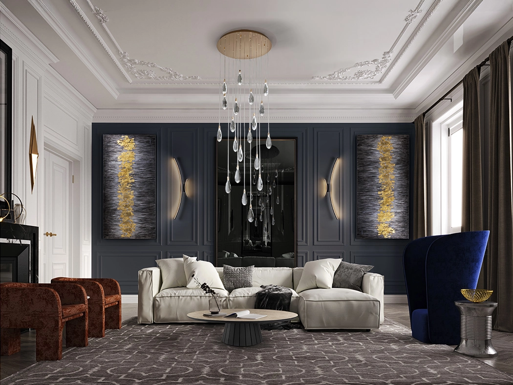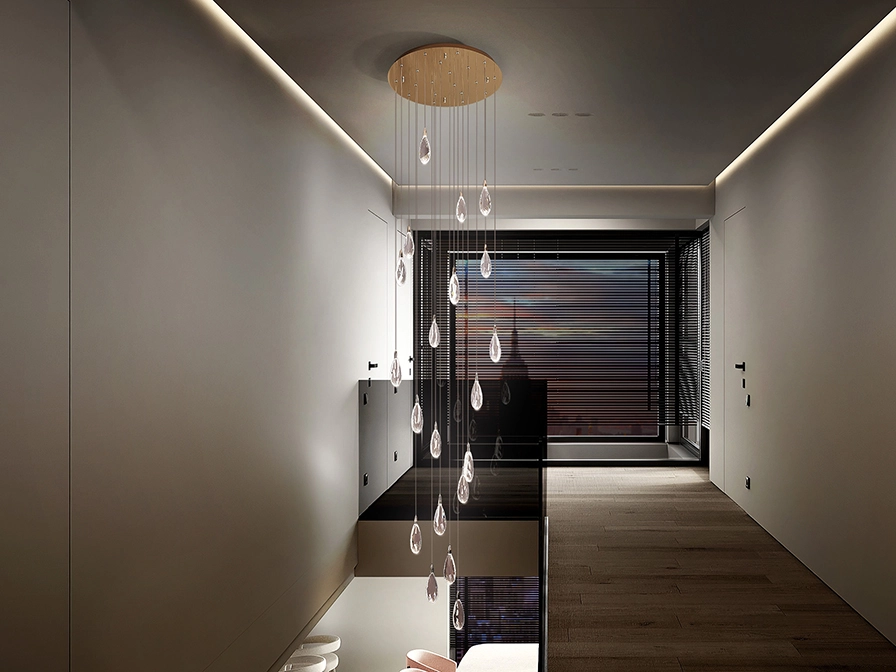 Candeeiro realizado em aço e metal, acabamento dourado rosa. 20 luzes com lágrimas de vidro gravado com rebordos craquelados.