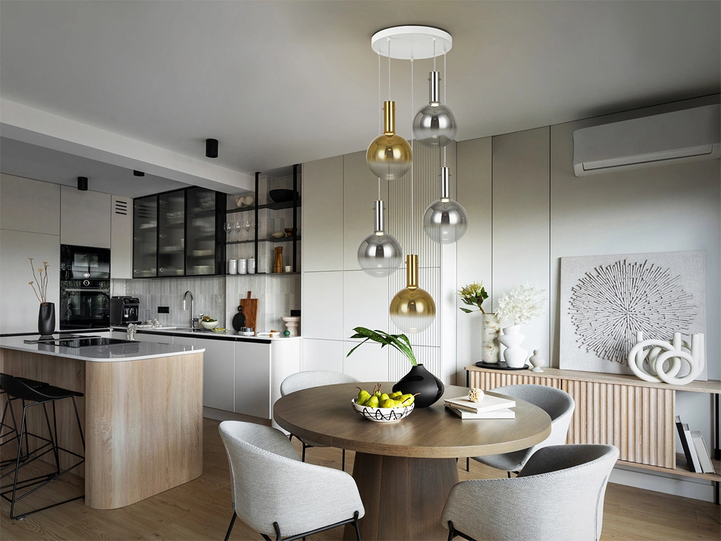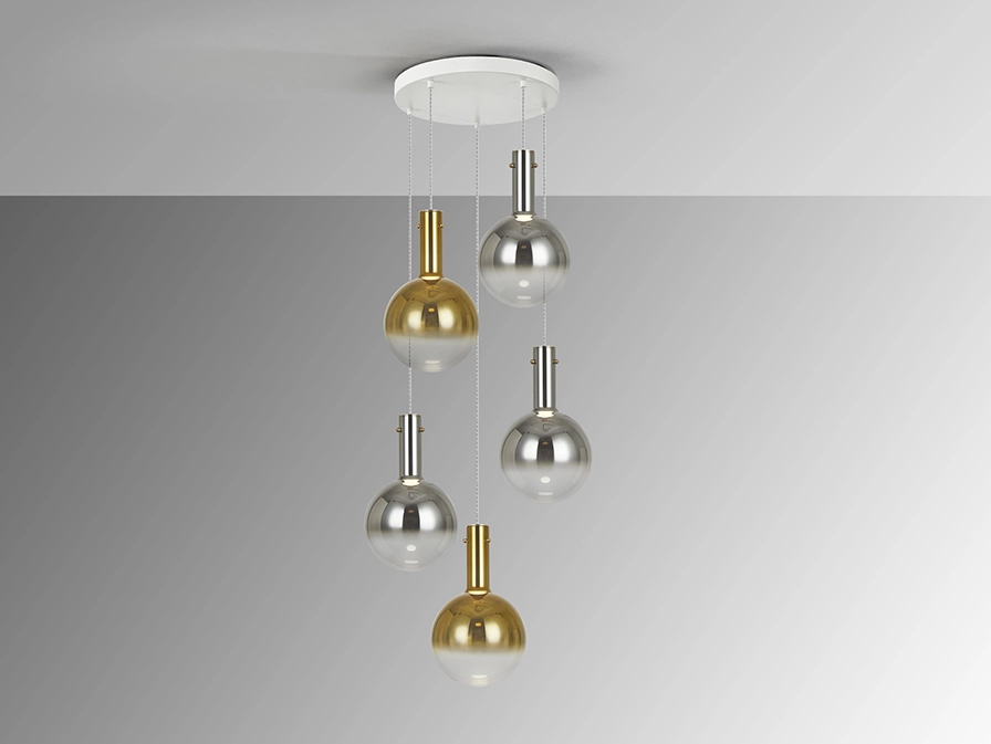 Candeeiro realizado em metal, acabamento branco mate. Abajures de vidro soprado de Ø20 cm, cinzento smoke espelhado e dourado espelhado.