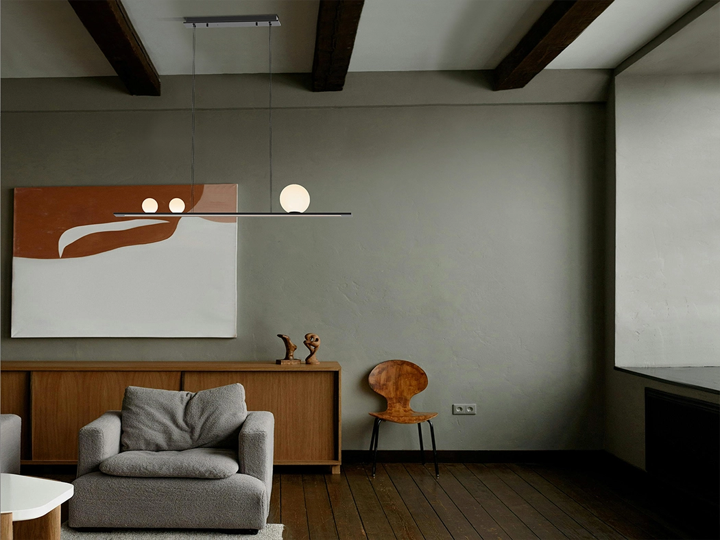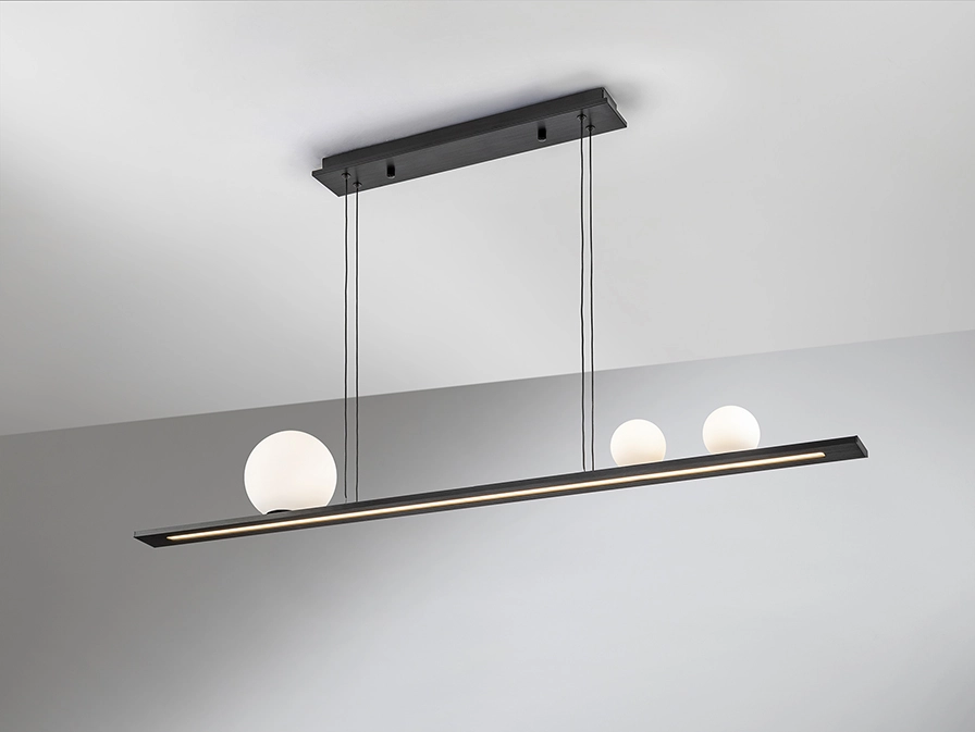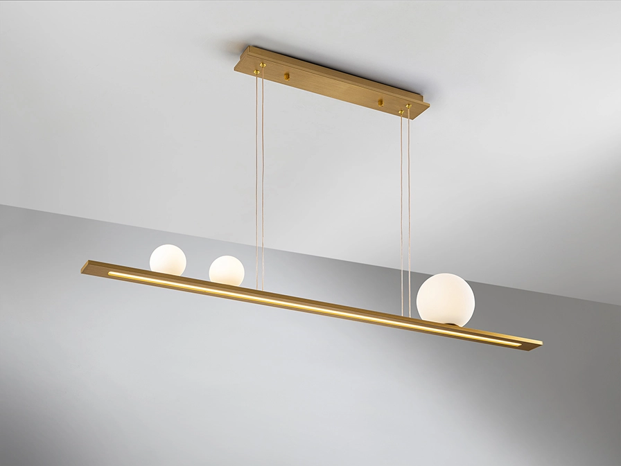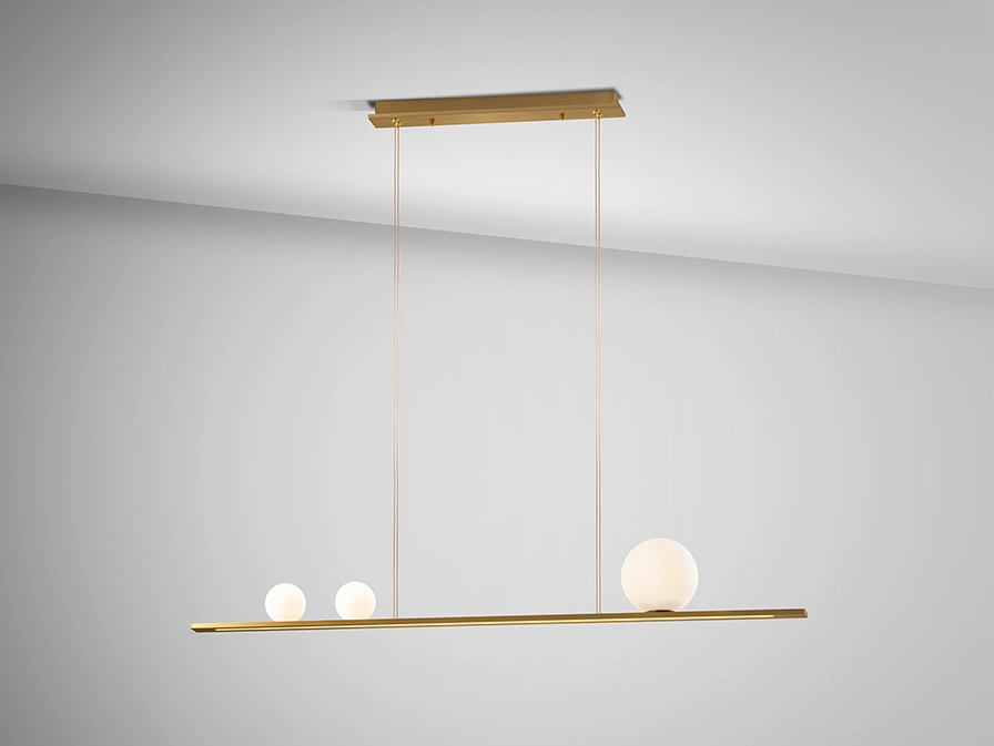 Na sala de jantar o ideal é que fique centrado sobre a mesa de jantar. A altura correta é crucial: cerca de 75 a 90 cm acima do tampo da mesa para não bloquear a visão nem encandear.