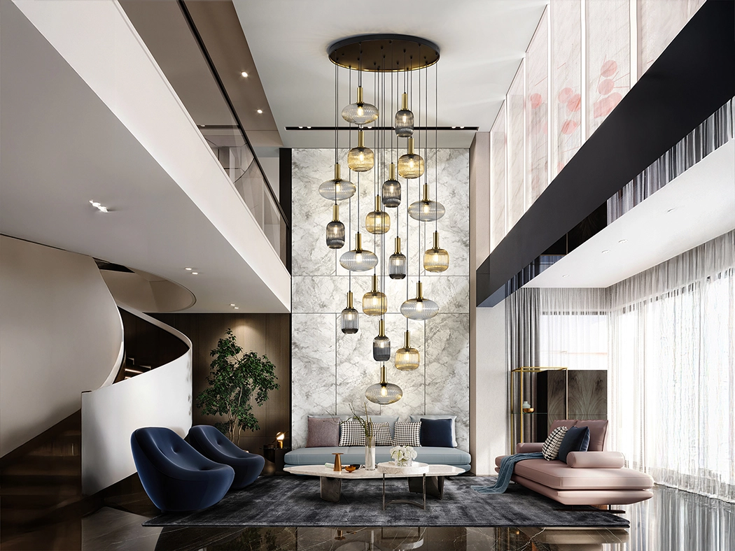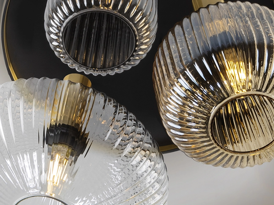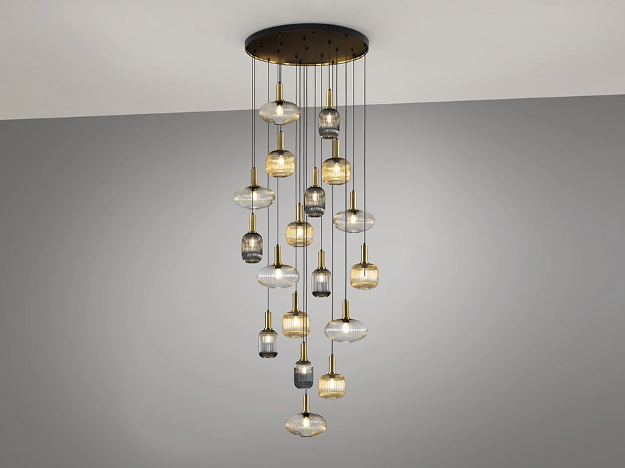 Candeeiro de 18 luzes realizado em metal com acabamento preto mate, com detalhes de latão acetinado. Abajures de vidro moldado com acabamento transparente, âmbar e cinzento smoke espelhado.