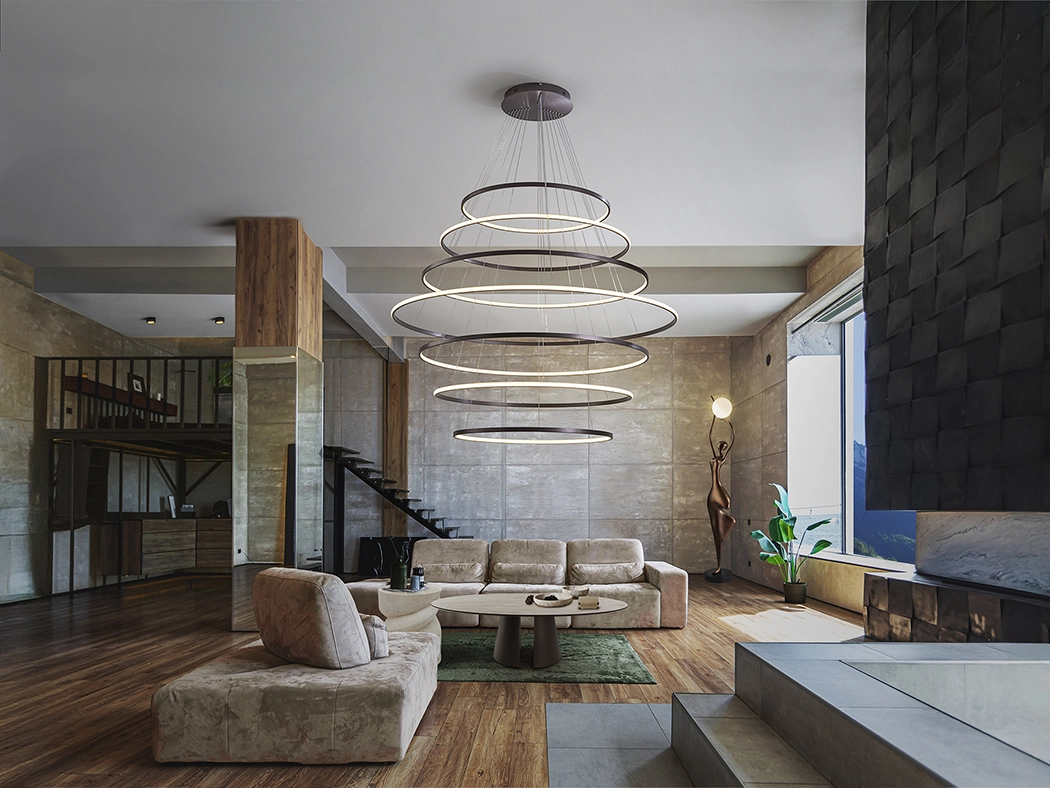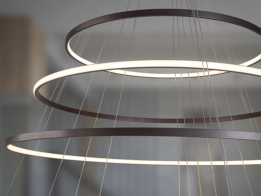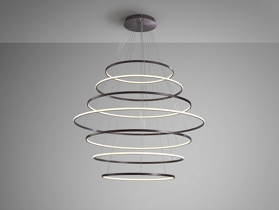 Candeeiro de 7 argolas realizado em alumínio, acabamento bronze escuro. Difusor de silicone.