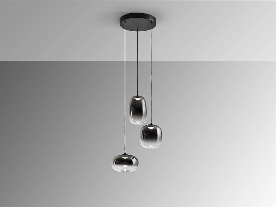 Candeeiro de 3 luzes realizado em metal acabamento preto mate. Abajures de vidro soprado, acabamento cinzento smoke, esfumado a transparente.
