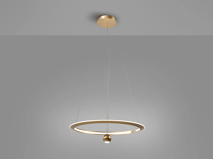 Candeeiro em aço e alumínio escovado, acabamento dourado anodizado. Difusor de silicone opalino