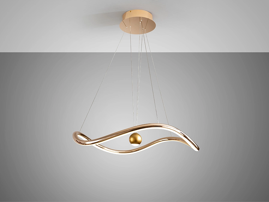Candeeiro realizado em alumínio e aço, acabamento em dourado brilho.