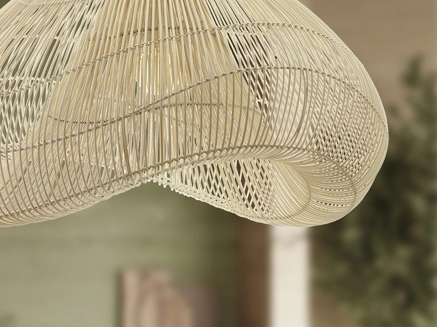 O candeeiro de teto sabah traz uma presença natural e serena a qualquer divisão. A sua estrutura em fibras trançadas e acabamento em tons claros cria uma iluminação suave que realça a textura dos materiais e envolve o espaço num ambiente acolhedor. O design orgânico e ligeiramente assimétrico funciona como peça decorativa central ao mesmo tempo que difunde a luz de forma elegante.