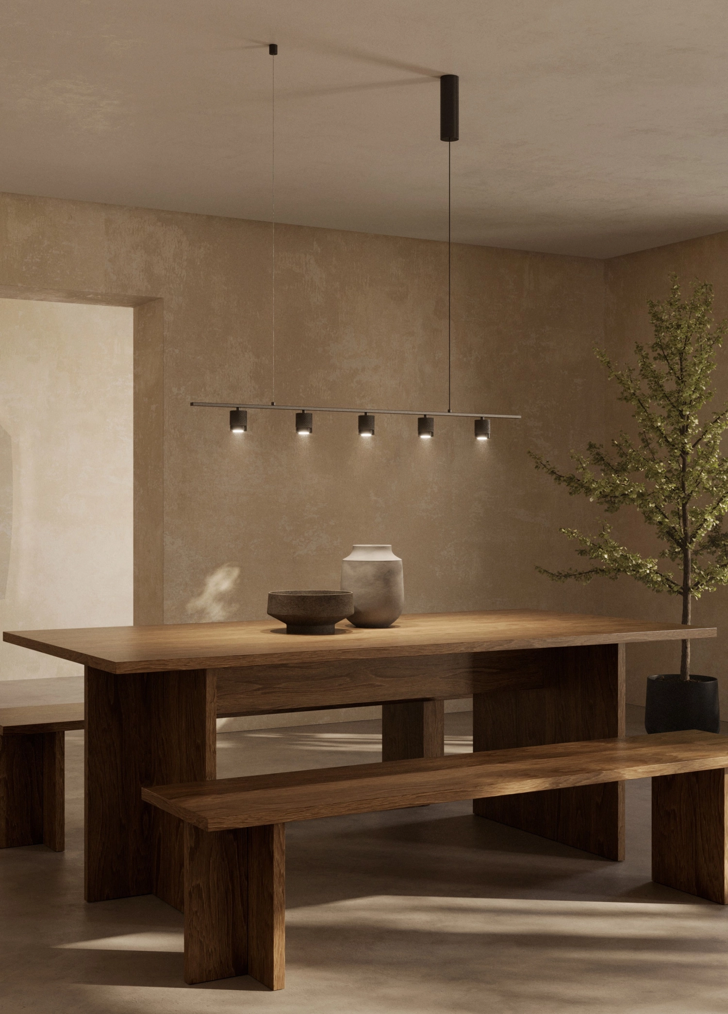 O candeeiro de teto tea traz uma presença elegante e discreta a qualquer decoração contemporânea. Com cinco focos orientados ao longo de uma barra suspensa cria iluminação directa sobre a mesa realçando pratos e objectos e promovendo um ambiente acolhedor para refeições e convívio. O seu perfil linear facilita a integração em salas de jantar e cozinhas modernas sem roubar protagonismo ao espaço. Ideal para quem procura funcionalidade aliada a estética minimalista este candeeiro valoriza zonas de encontro e melhora a atmosfera do espaço com luz focada e bem distribuída.