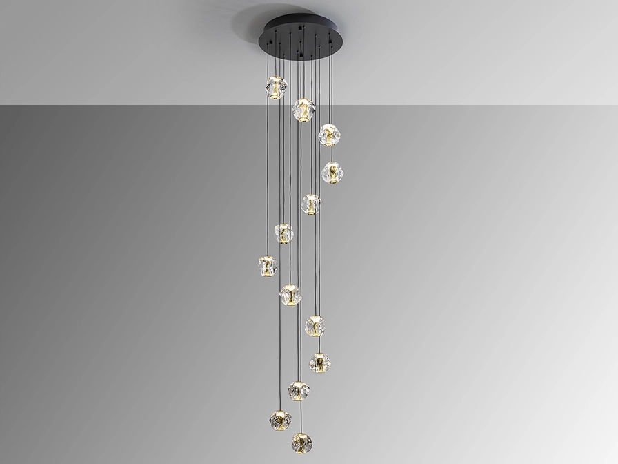 Candeeiro de 13 luzes realizado em metal com acabamento preto mate, com detalhes dourados e abajures de acrílico transparente.