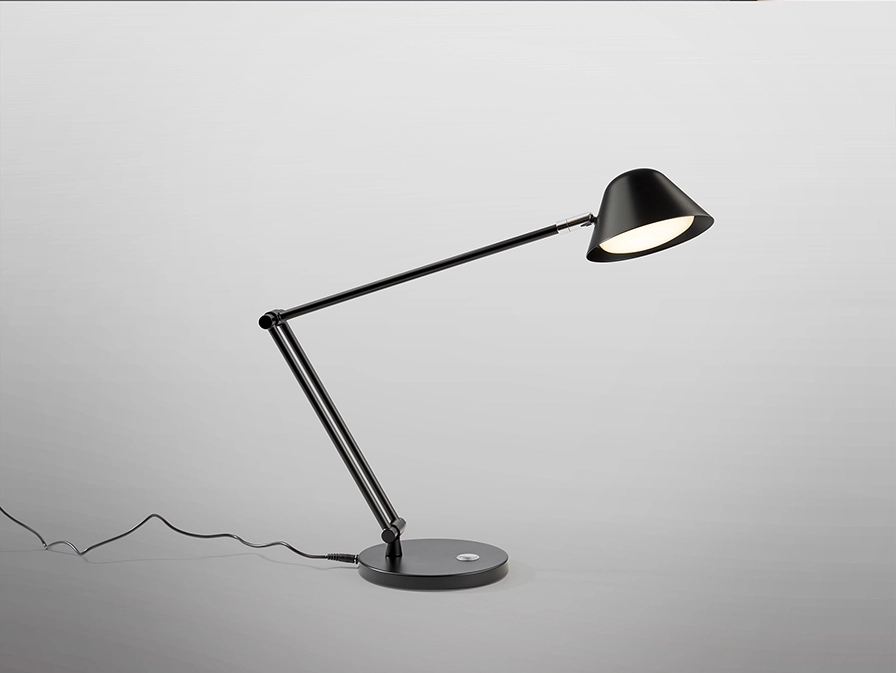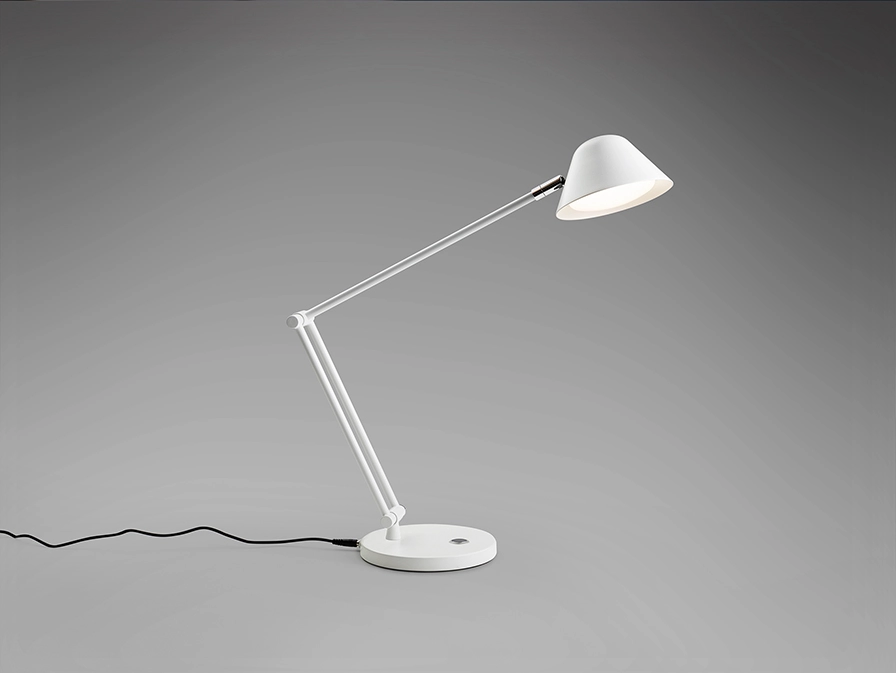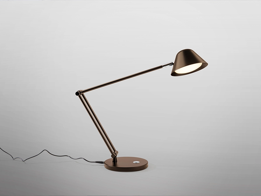 Candeeiro de secretária com braço articulado, realizado em metal e alumínio, acabamento branco, preto mate. ou bronze escuro.