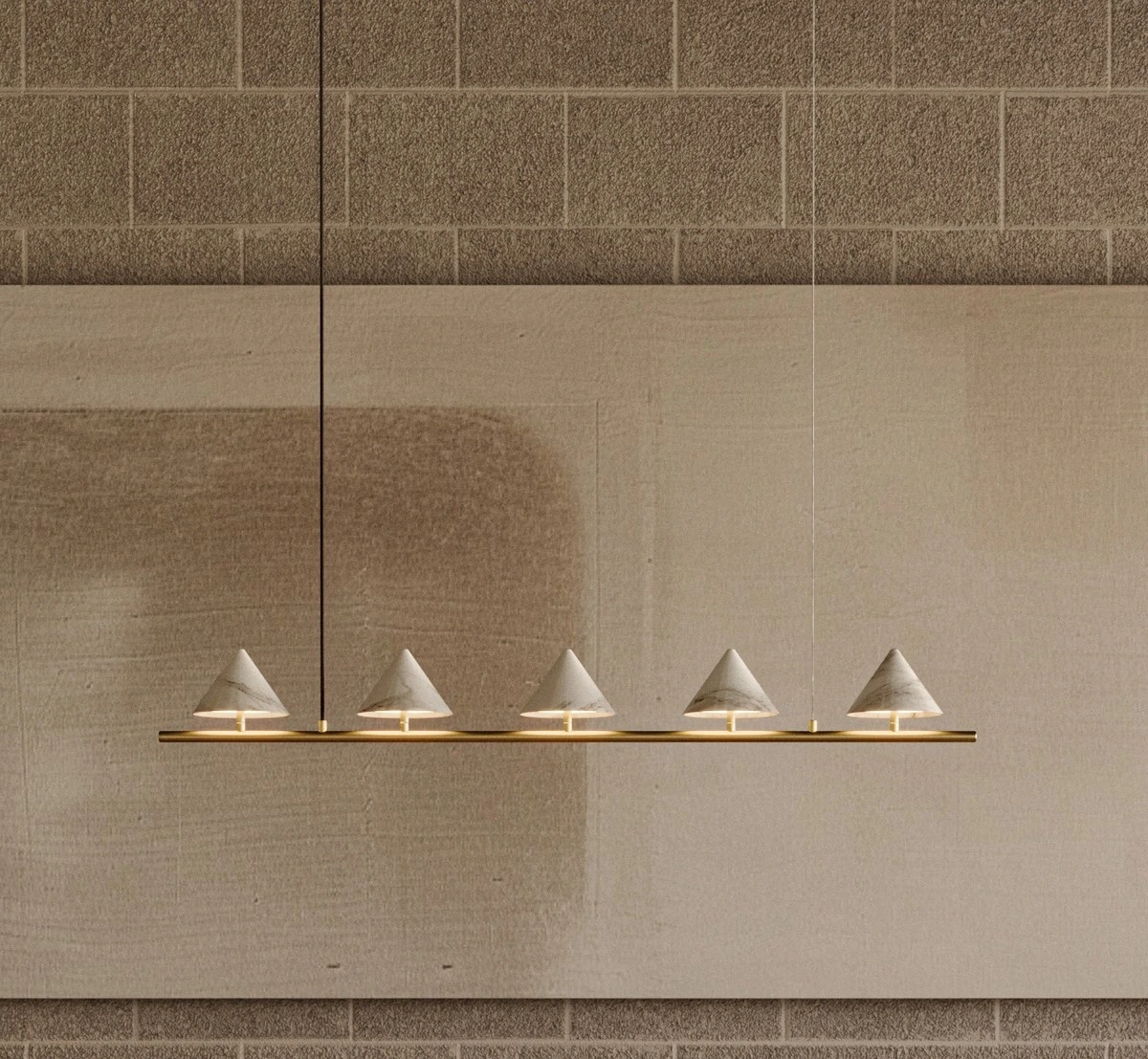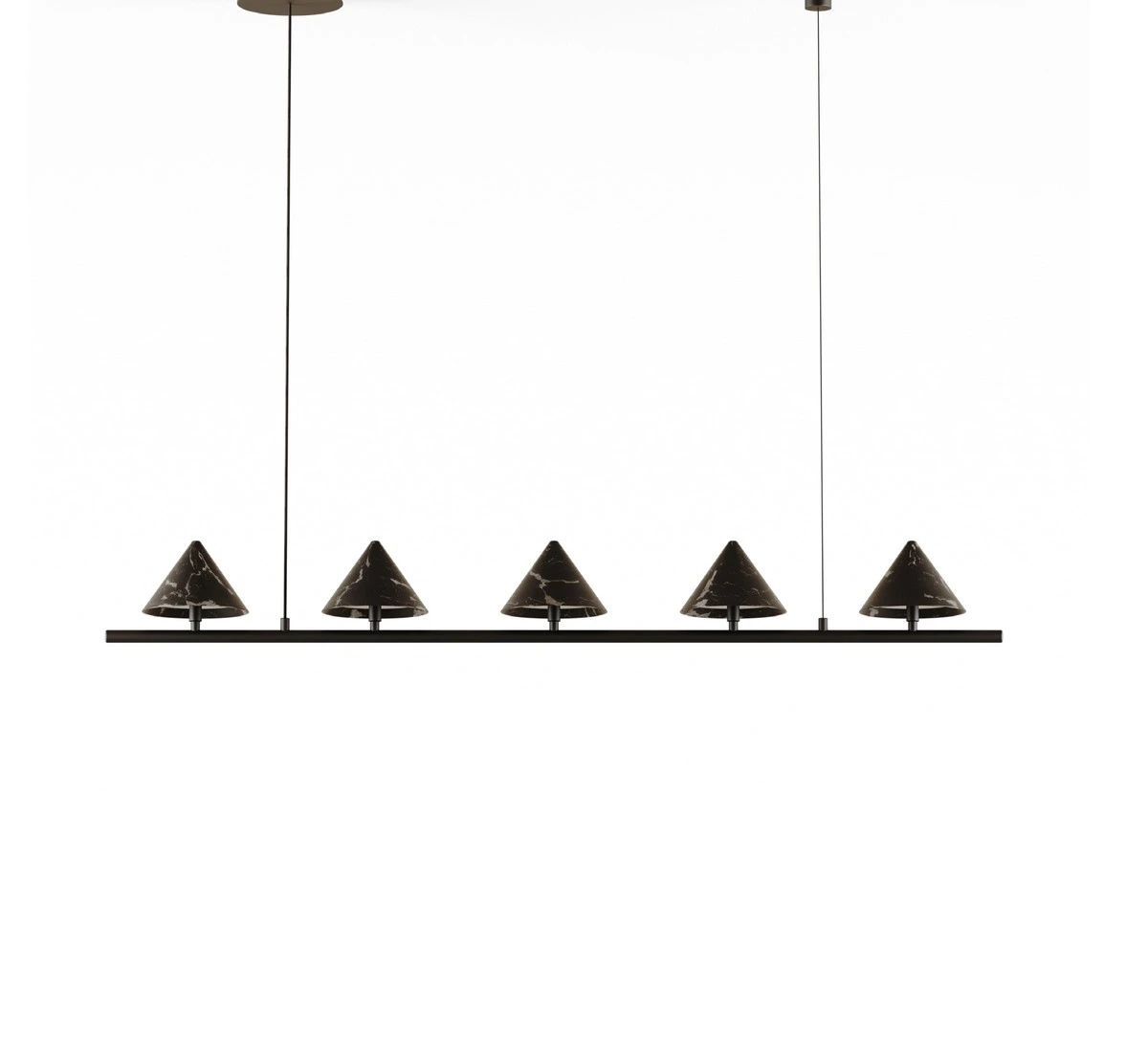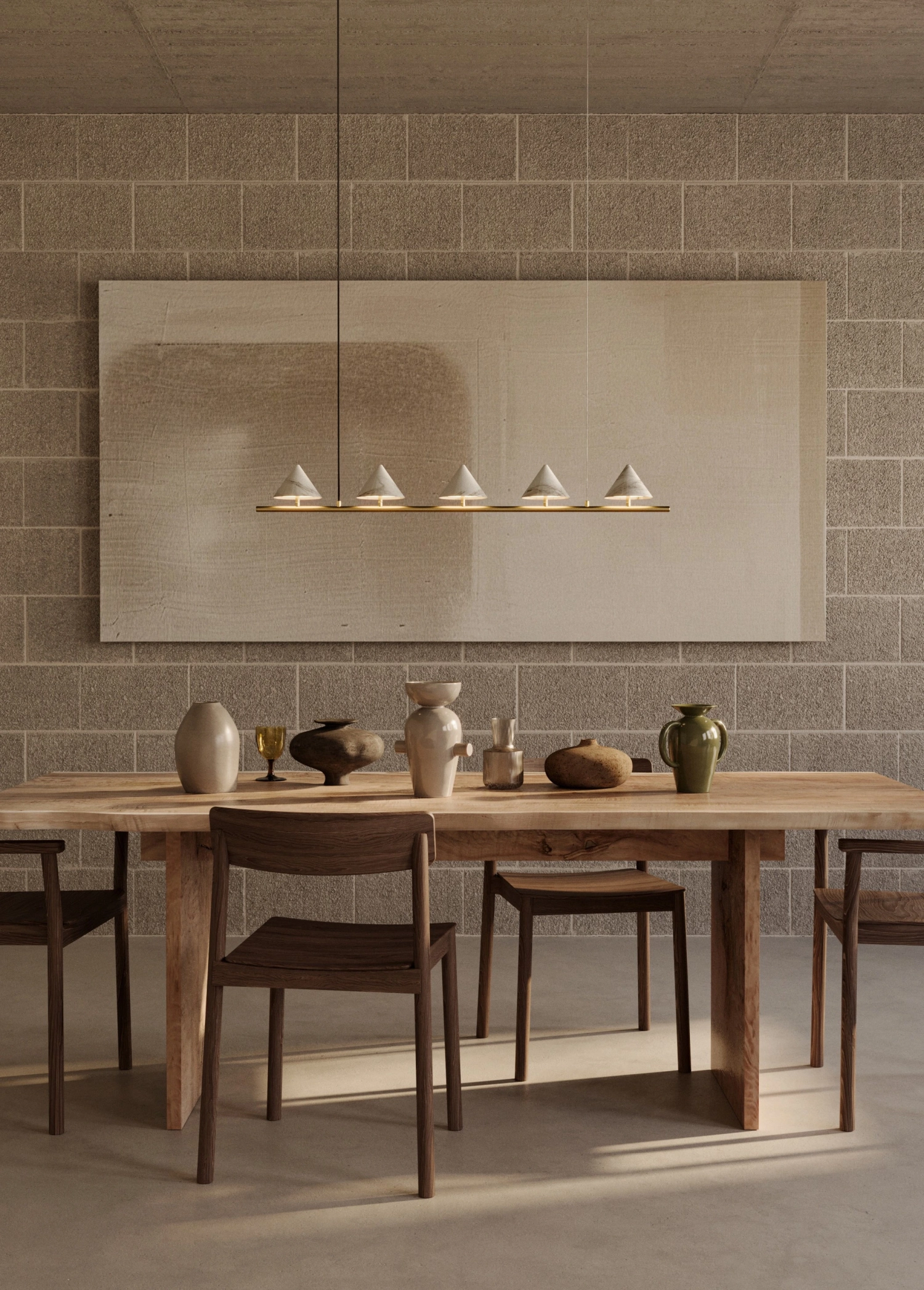 O candeeiro suspenso Anza combina linhas minimalistas e presença marcante para transformar a área de refeições num espaço acolhedor. Várias cúpulas cónicas alinhadas sobre um perfil fino proporcionam iluminação homogénea ideal para mesas compridas, realçando pratos e texturas da decoração. A sua estética contemporânea confere um ponto focal elegante sem sobrecarregar o ambiente, adaptando-se a interiores modernos e clássicos. Perfeito para sala de jantar ou cozinha, oferece ambiente convidativo e sofisticado enquanto valoriza o design do espaço. Uma solução prática e estilosa para quem procura funcionalidade com charme.